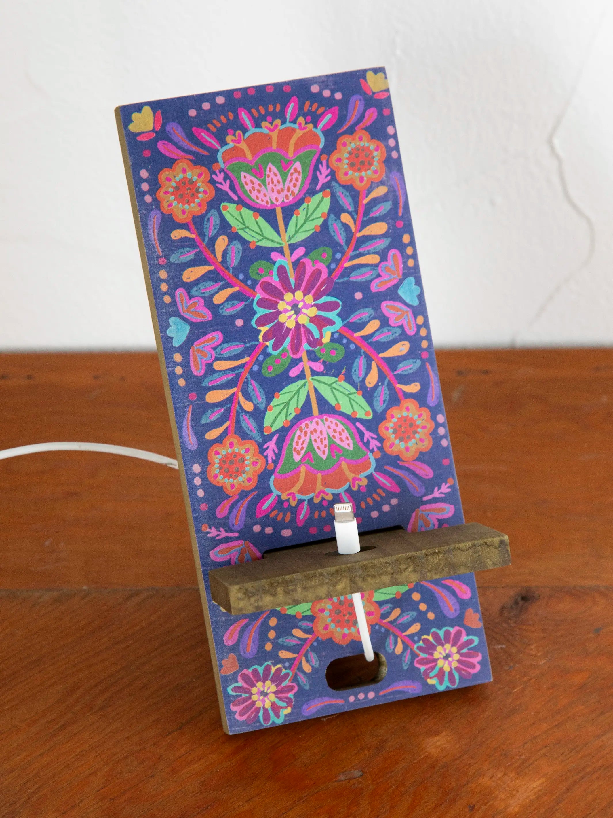 Wooden Phone Stand - Navy Folk Flower