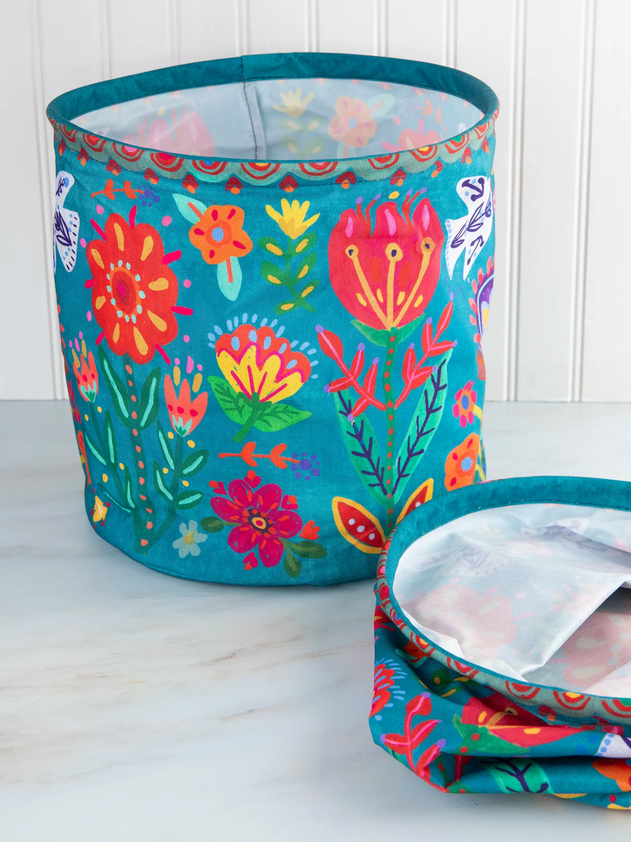 Collapsible Trash / Storage Bin - Teal Folk Flower
