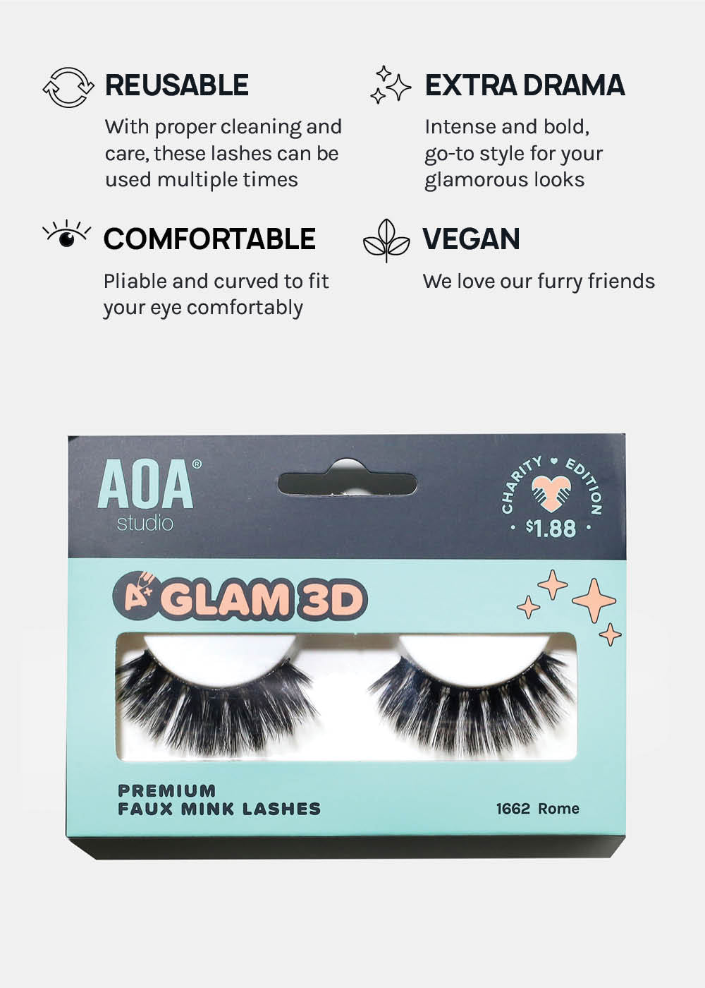 GLAM, super WISPY, + stacked, A+ Glam 3D Faux Mink Eyelashes are 100% Vegan fiber layered to add fluttery length + volume to all eye shapes. Features a wide lash band to last multiple wears.