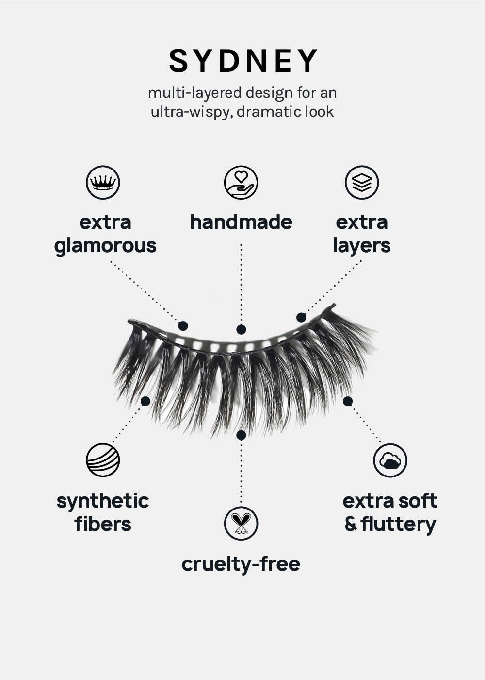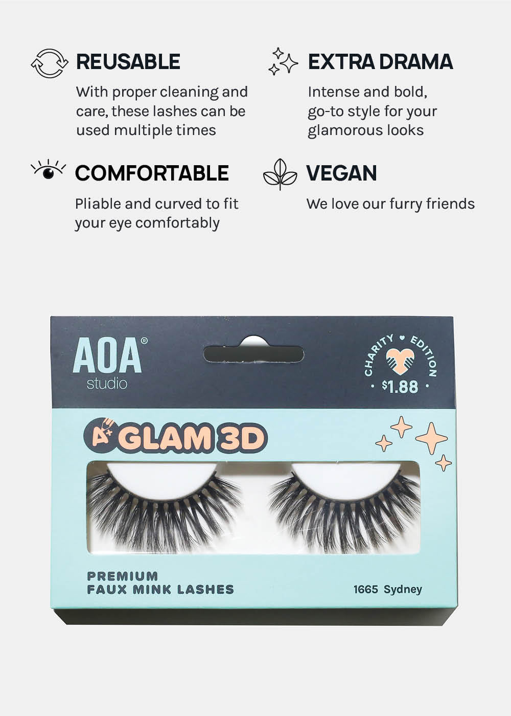 GLAM, super WISPY, + stacked, A+ Glam 3D Faux Mink Eyelashes are 100% Vegan fiber layered to add fluttery length + volume to all eye shapes. Features a wide lash band to last multiple wears.