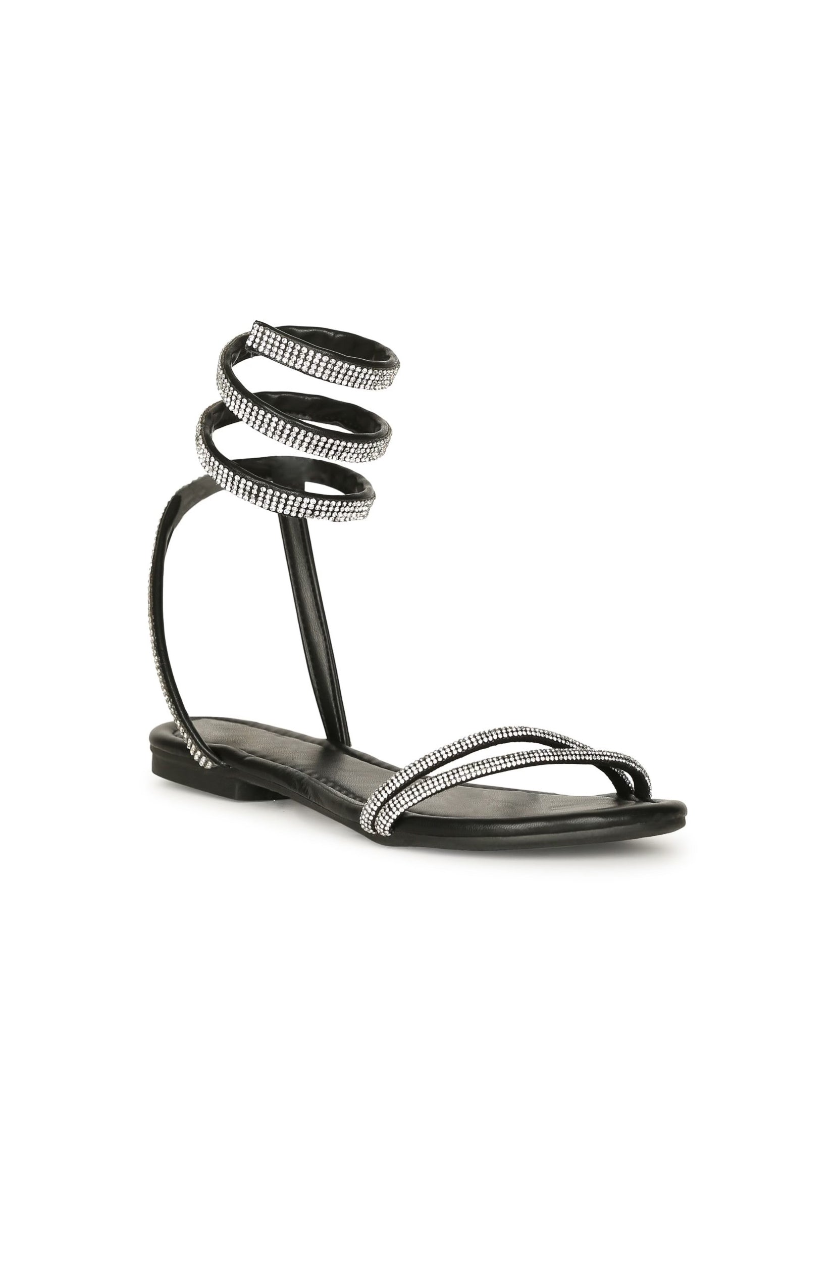 Experience refined comfort in Aeryn's enchanting spiral coil flat sandals. Embellished with rhinestone straps and adjustable spiral coil straps, these flats are perfect for any occasion. Choose from two colors and slip into their lightly padded insole for a luxurious feel. Are you ready to experience the true beauty of style and comfort?