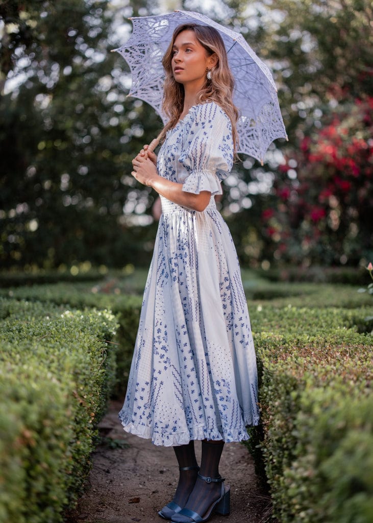 The Alice Dress from our Tea Time Collection is a versatile and stylish piece for any occasion. Features a delicate blue floral print on a soft airy fabric, complemented by a smocked waist and ruffle elastic sleeves for a flattering, feminine silhouette. Perfect for tea parties, garden strolls, or any occasion that calls for a touch of charm.