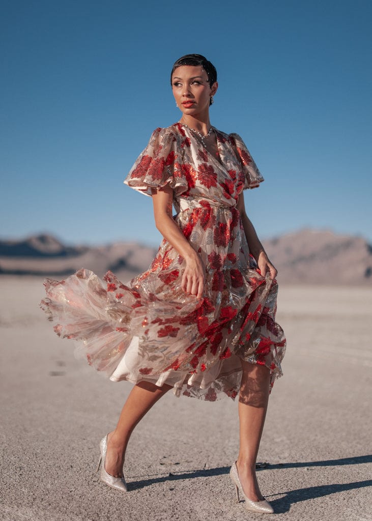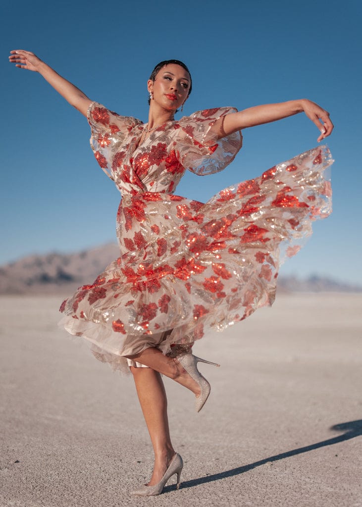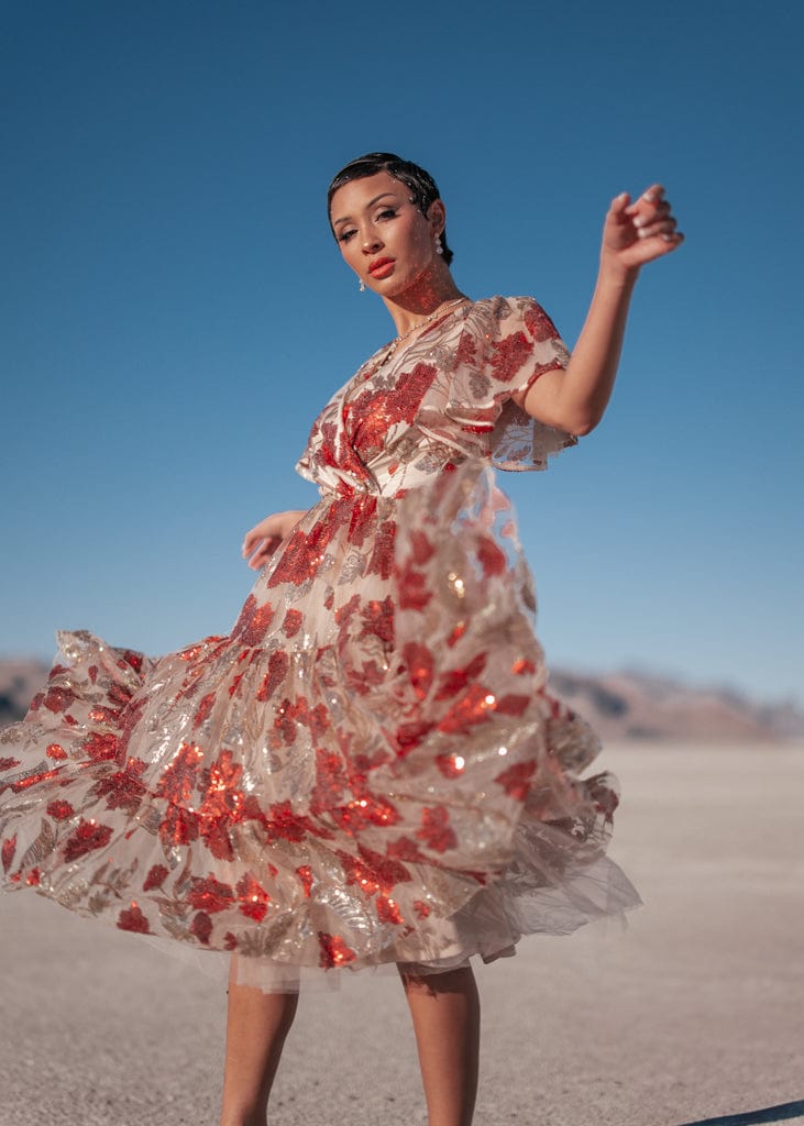Step into a world of glamour with the Anna Dress, a standout piece from our Celestial Collection. Adorned with vibrant red and gold sequins on a soft nude base, this dress captures the magic of celebration. Its flowy silhouette and elastic puff sleeves offer a timeless elegance, perfect for New Year's Eve and all the holiday festivities. Shine bright and make every moment unforgettable in this stunning design.