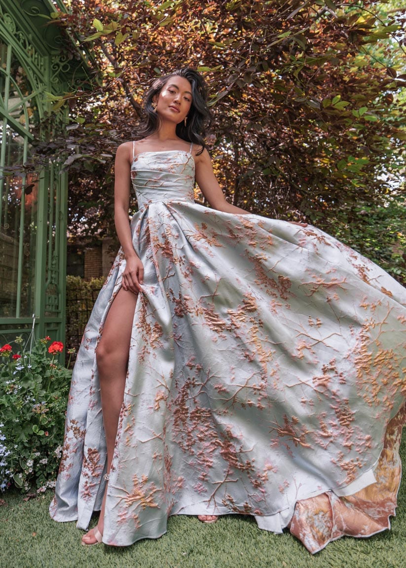 The Arabella Dress is the epitome of timeless elegance and sophistication. This stunning gown features a delicate pattern that evokes the beauty of a blossoming tree. The luxurious fabric drapes gracefully, accentuating the figure with a flattering A-line silhouette and a daring thigh-high slit for a touch of modern allure. With its elegant spaghetti straps and refined square neckline, the Arabella Dress exudes understated glamour. Perfect for any formal event, this enchanting dress promises to make you feel like a true queen.