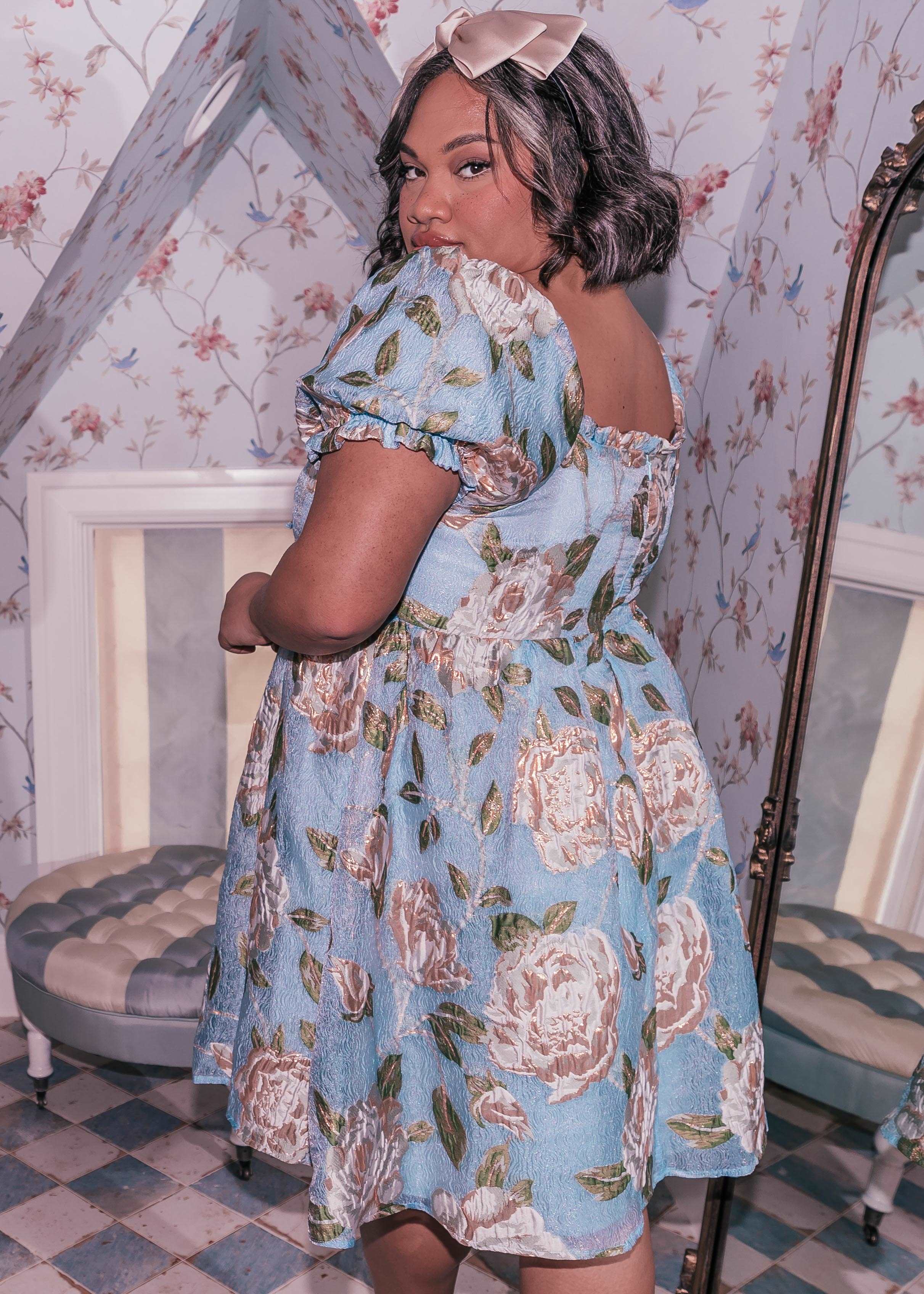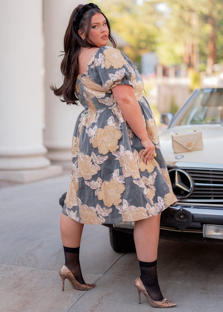 Add a touch of romance to your day with the Beaumont. This mini babydoll dress features kisses of shimmering gold accents, with a ruched bow detail and hidden back zipper. The textured fabric is perfect for all body types, while the elastic puff sleeves add a sweet finishing touch.