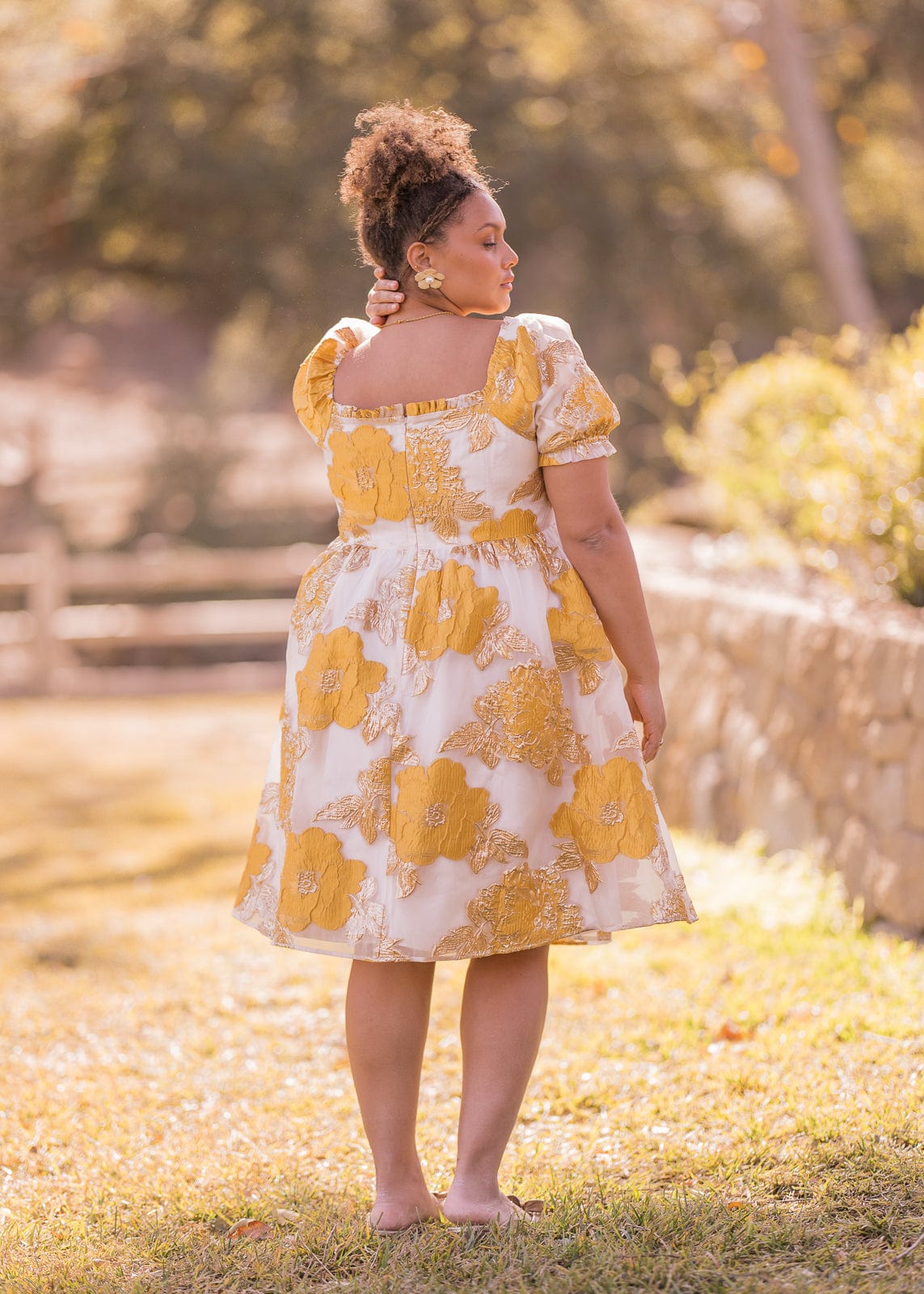 Add a touch of romance to your day with the Beaumont. This mini babydoll dress features kisses of shimmering gold accents, with a ruched bow detail and hidden back zipper. The textured fabric is perfect for all body types, while the elastic puff sleeves add a sweet finishing touch.