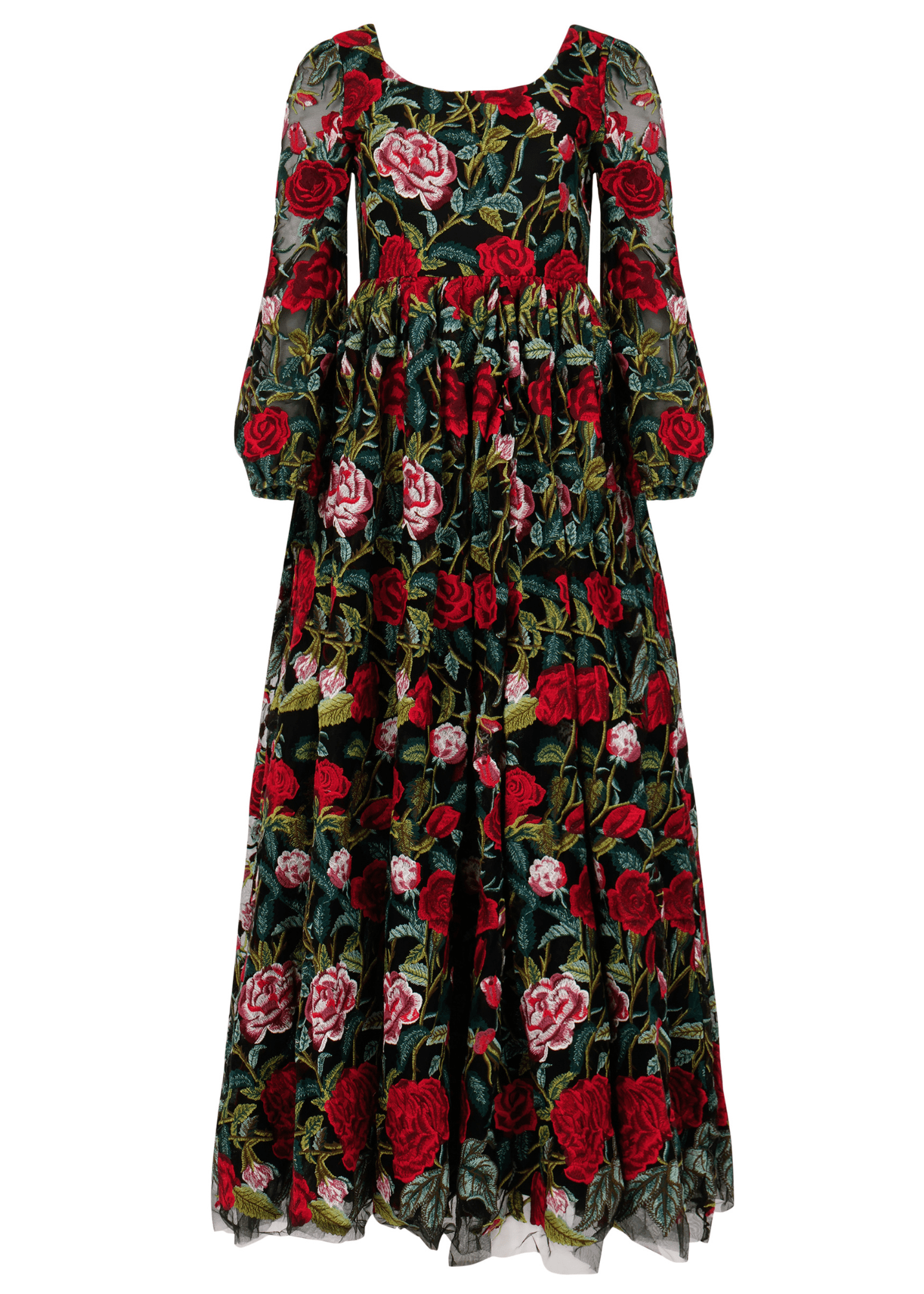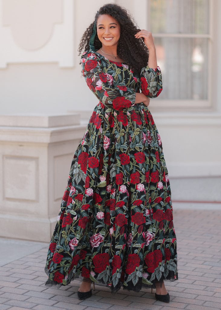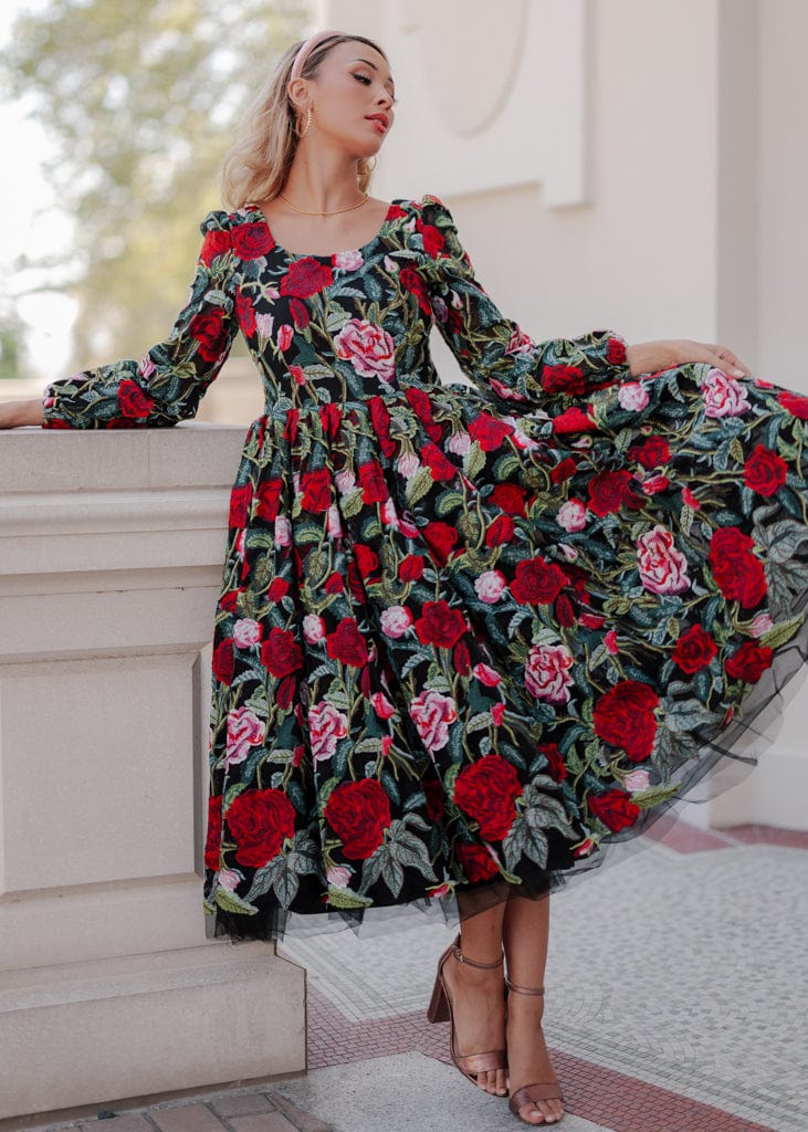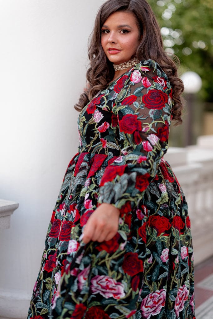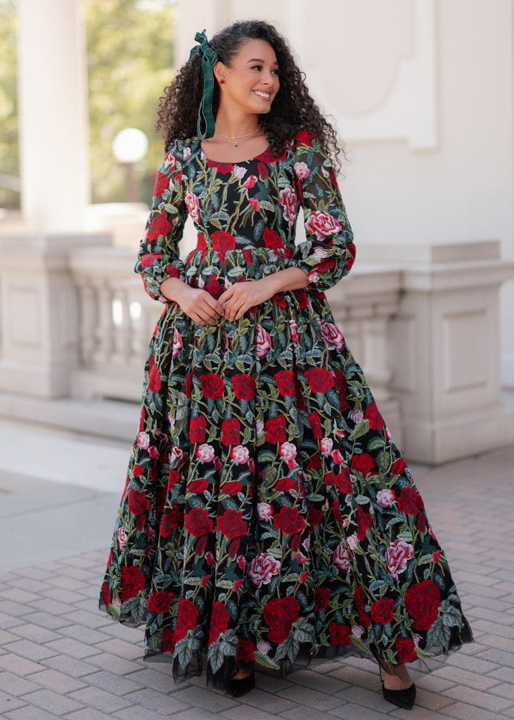 Step into holiday enchantment with the Briar Dress from our Plaza Collection. This gown features a tapestry of red and pink roses, delicately embroidered over a black backdrop. Elegant long sleeves and its timeless silhouette make it the perfect choice for any holiday event. Whether you choose the Midi or Maxi version, the Briar whispers promises of an enchanting evening filled with laughter, love, and memories that will last a lifetime.