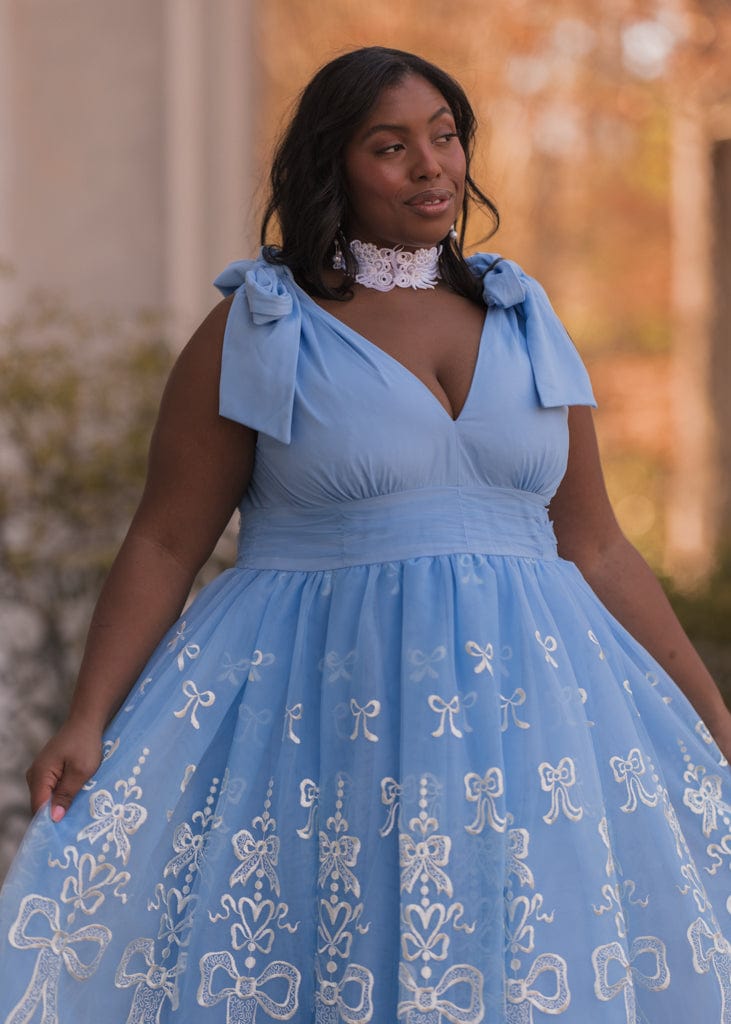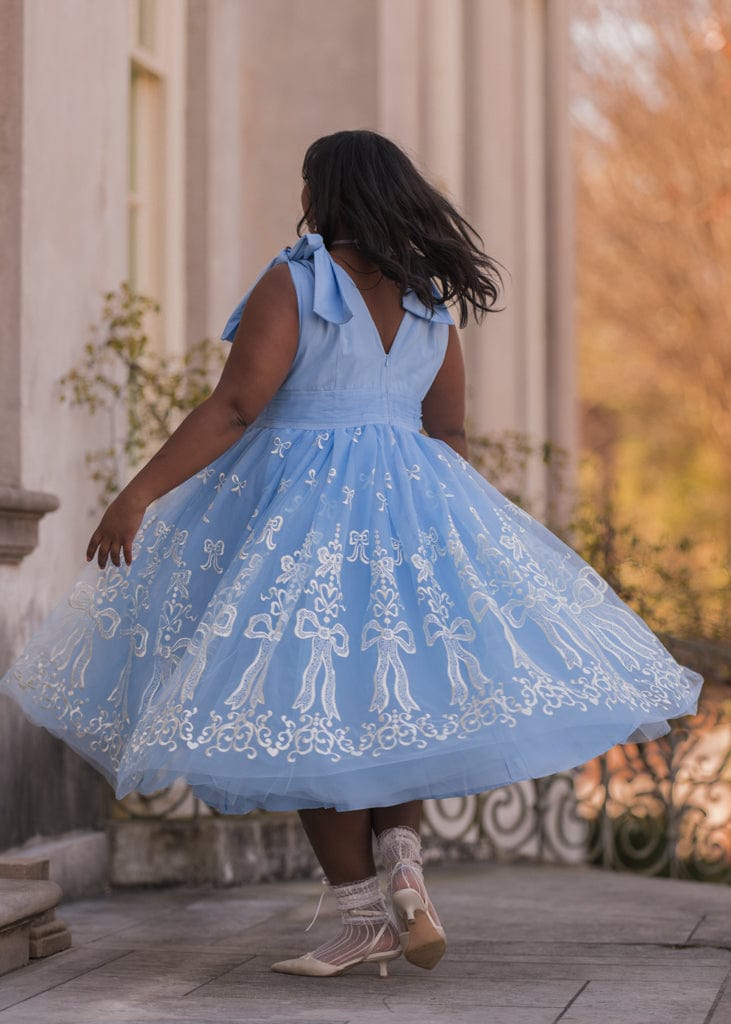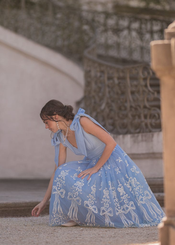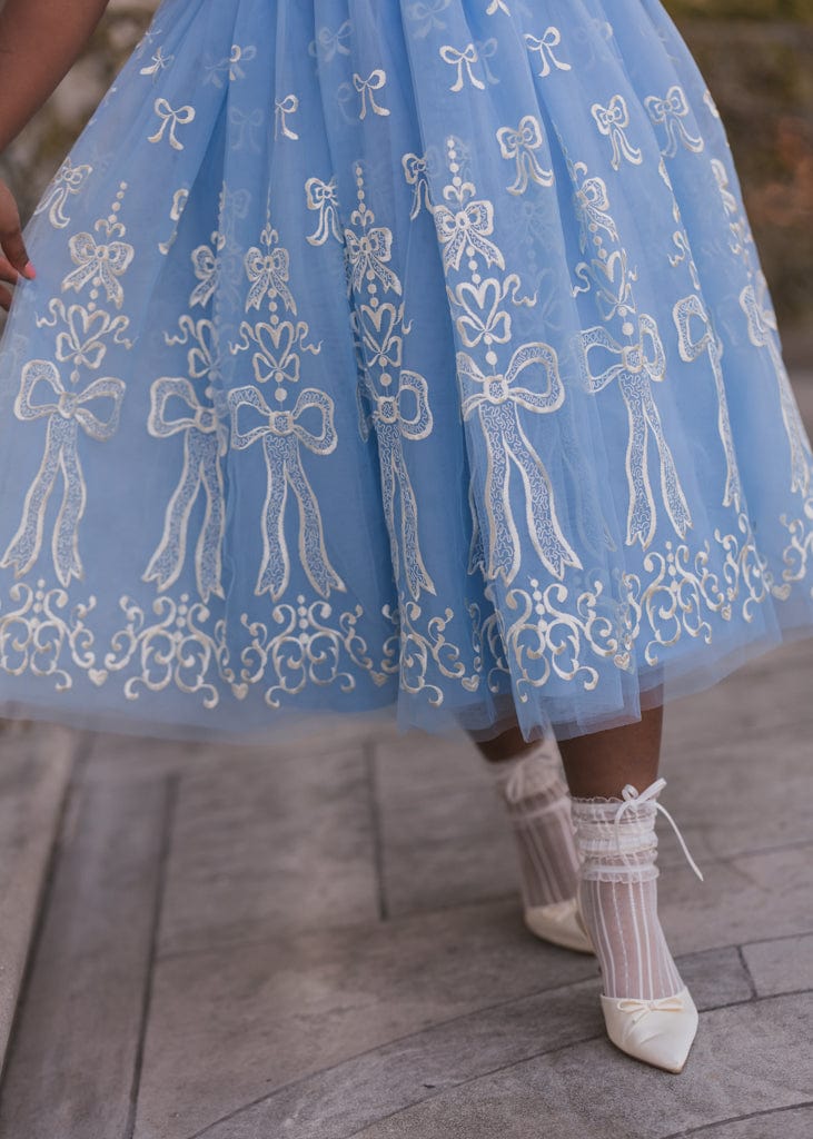 The Cindy Dress is a fairytale-inspired design, featuring a dreamy blue tulle overlay embellished with intricate white bow embroidery. With elegant bow-tied straps, a flattering V-neckline, and a voluminous skirt, this dress exudes timeless charm and grace. Perfect for special occasions, it’s a captivating choice for making unforgettable memories.