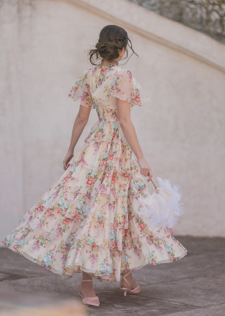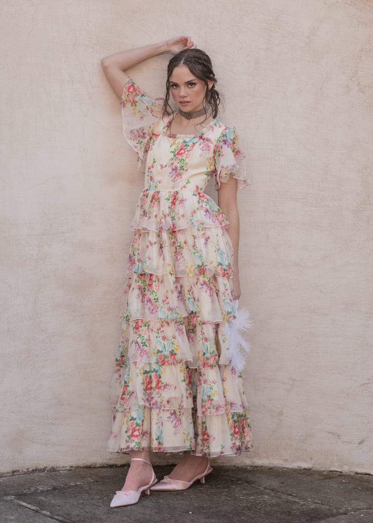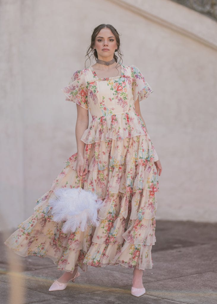 The Clarabelle Dress is a floral fantasy, featuring cascading tiers of soft, pastel-printed fabric that create a dreamy silhouette. Delicate flutter sleeves and a square neckline add a touch of vintage charm, while the vibrant floral pattern makes it perfect for springtime events or garden parties. Effortlessly elegant, this dress is designed to make a statement wherever you go.