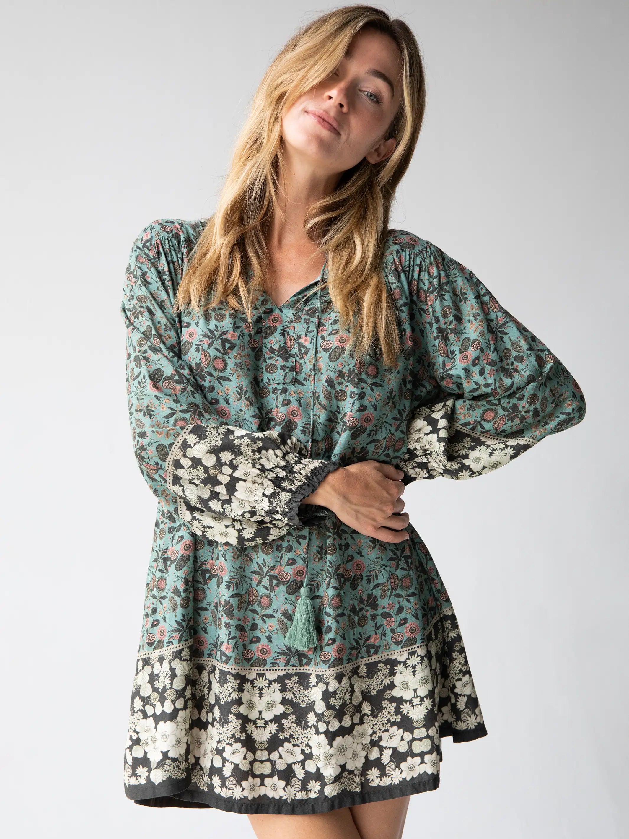 Dara V-Neck Tunic Dress - Sage Black Floral Border