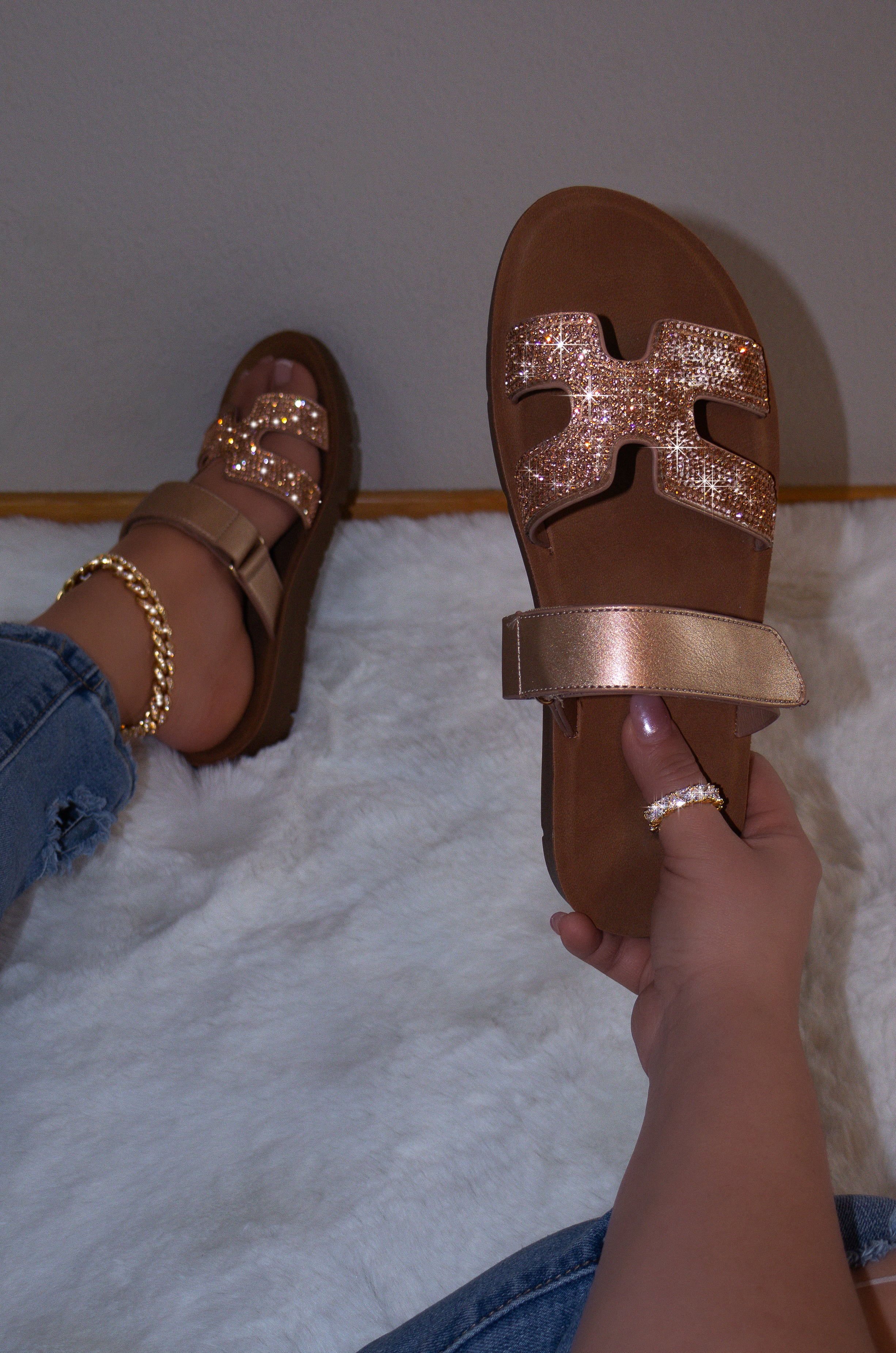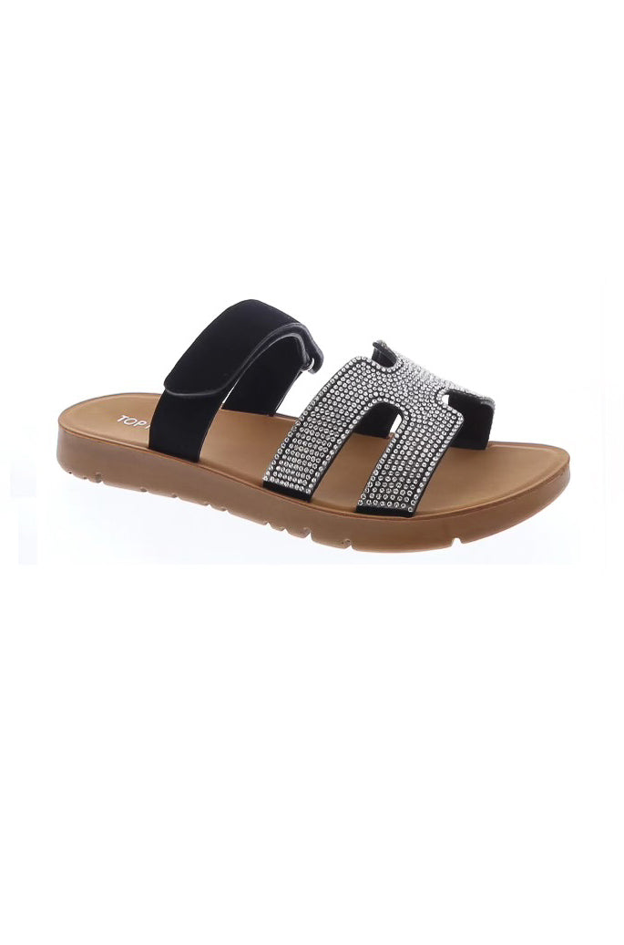 Step into style with our Denver Embellished Slip On Sandals. These sandals feature an open, rounded toe design and an adjustable velcro strap for a comfortable and customizable fit. Adorned with rhinestone straps, they add a touch of glamour to any outfit. With a 1" heel and lightly padded insole, these sandals are both fashionable and functional. Perfect for any occasion and true to size.