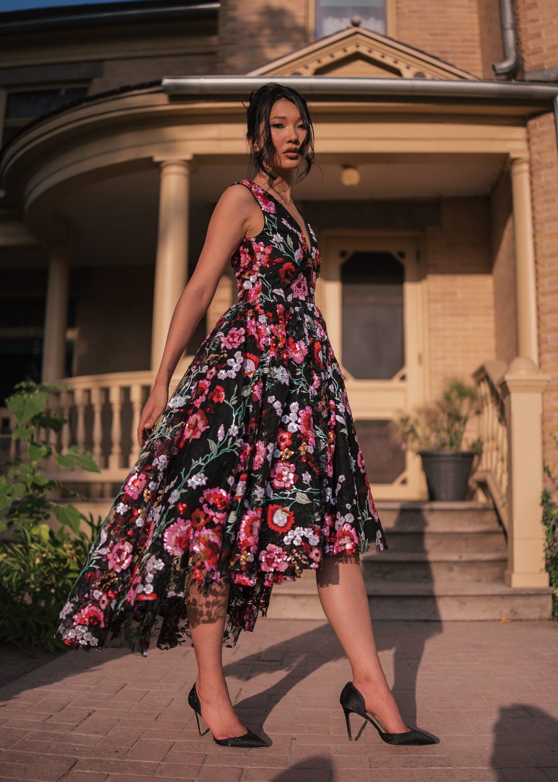 Ebony Rose is a captivating celebration of romance and elegance, featuring a rich tapestry of vibrant florals set against a deep black background. The plunging neckline and high-low hemline add a modern twist to this classic silhouette, making it perfect for those who want to make a bold yet feminine statement. Whether you're attending a garden party or an evening soiree, this gown is your go-to for a look that's both timeless and unforgettable.