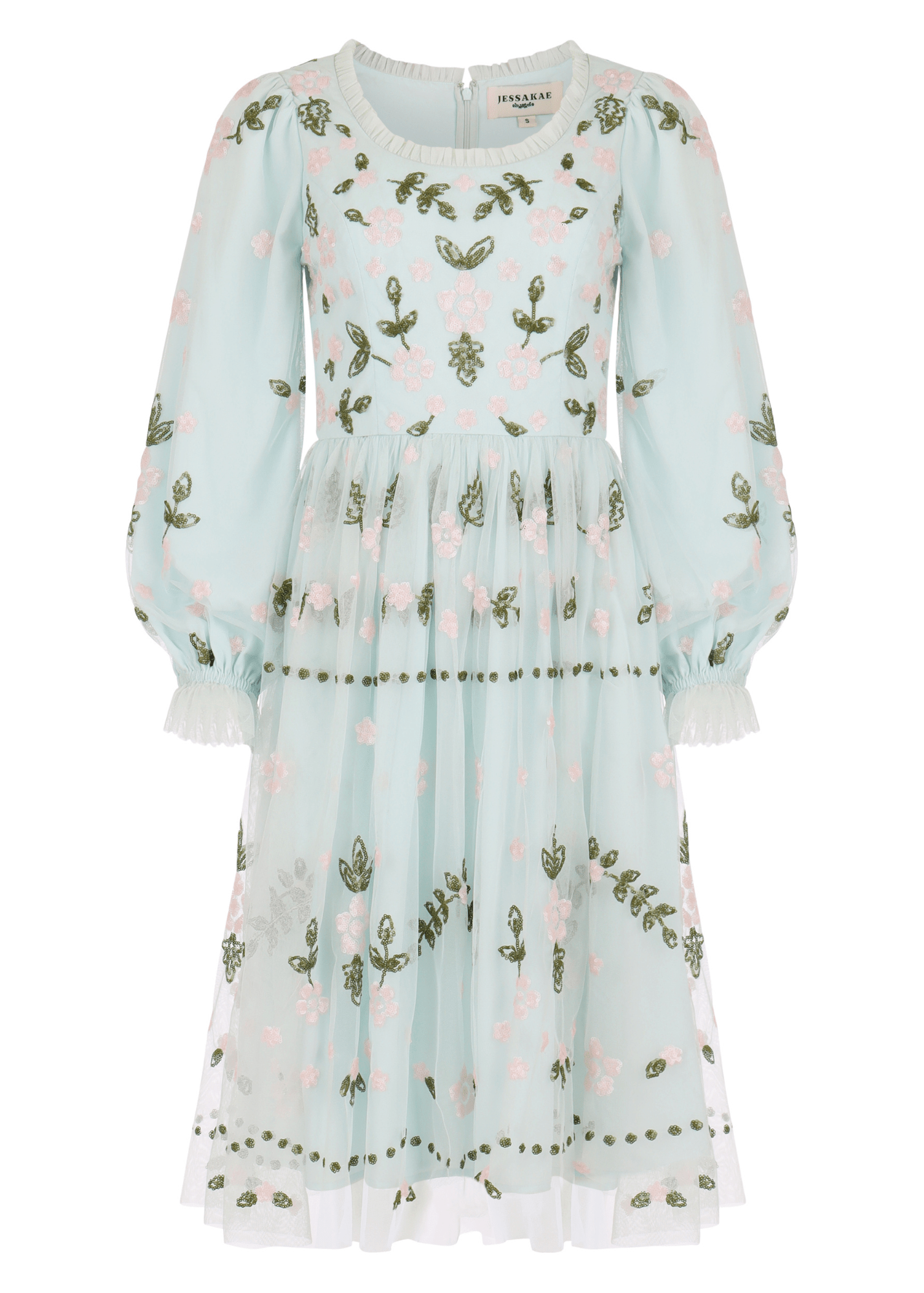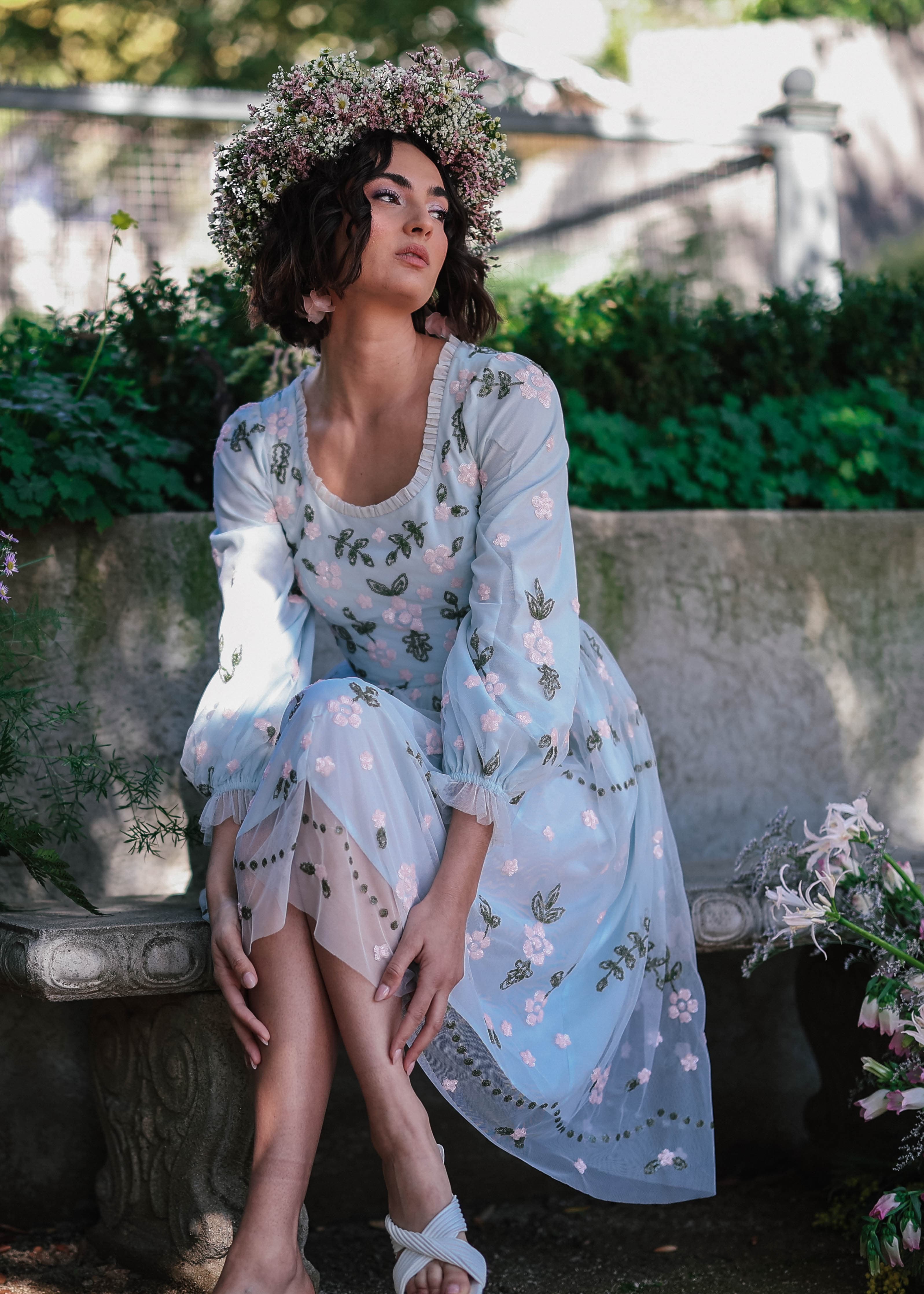Designed for the dreamers and free spirits. Meticulously woven in shades of pink and green embroidery, this powdery blue dream is reminiscent of nature's beauty. Whether you're twirling through sunlit gardens or simply strolling through life's beautiful moments, the Elina Dress will be your perfect companion.
