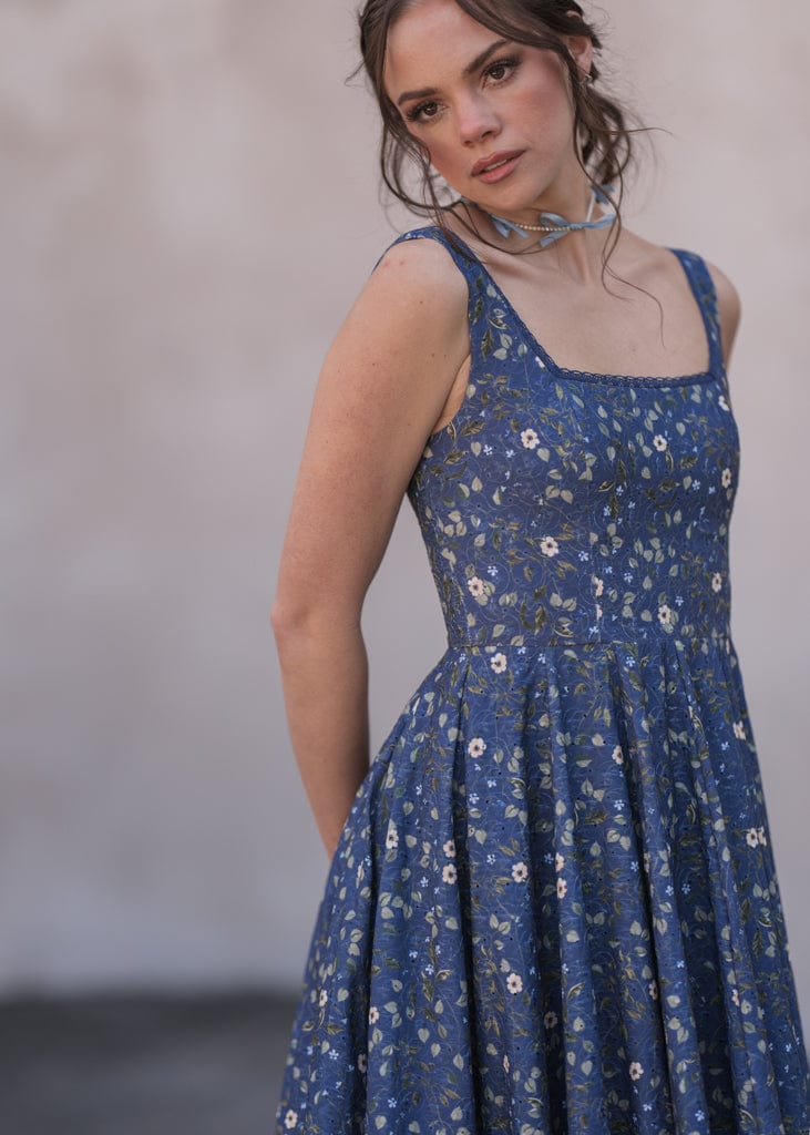 The Eve Dress is a charming and versatile piece, featuring a delicate floral print on a deep navy backdrop. Designed with a square neckline, fitted bodice, and a flowing skirt with ruffle detailing at the hem, it offers a touch of effortless elegance. Perfect for casual outings or garden strolls, this dress combines comfort and style for any occasion. Same silhouette as our best-selling .