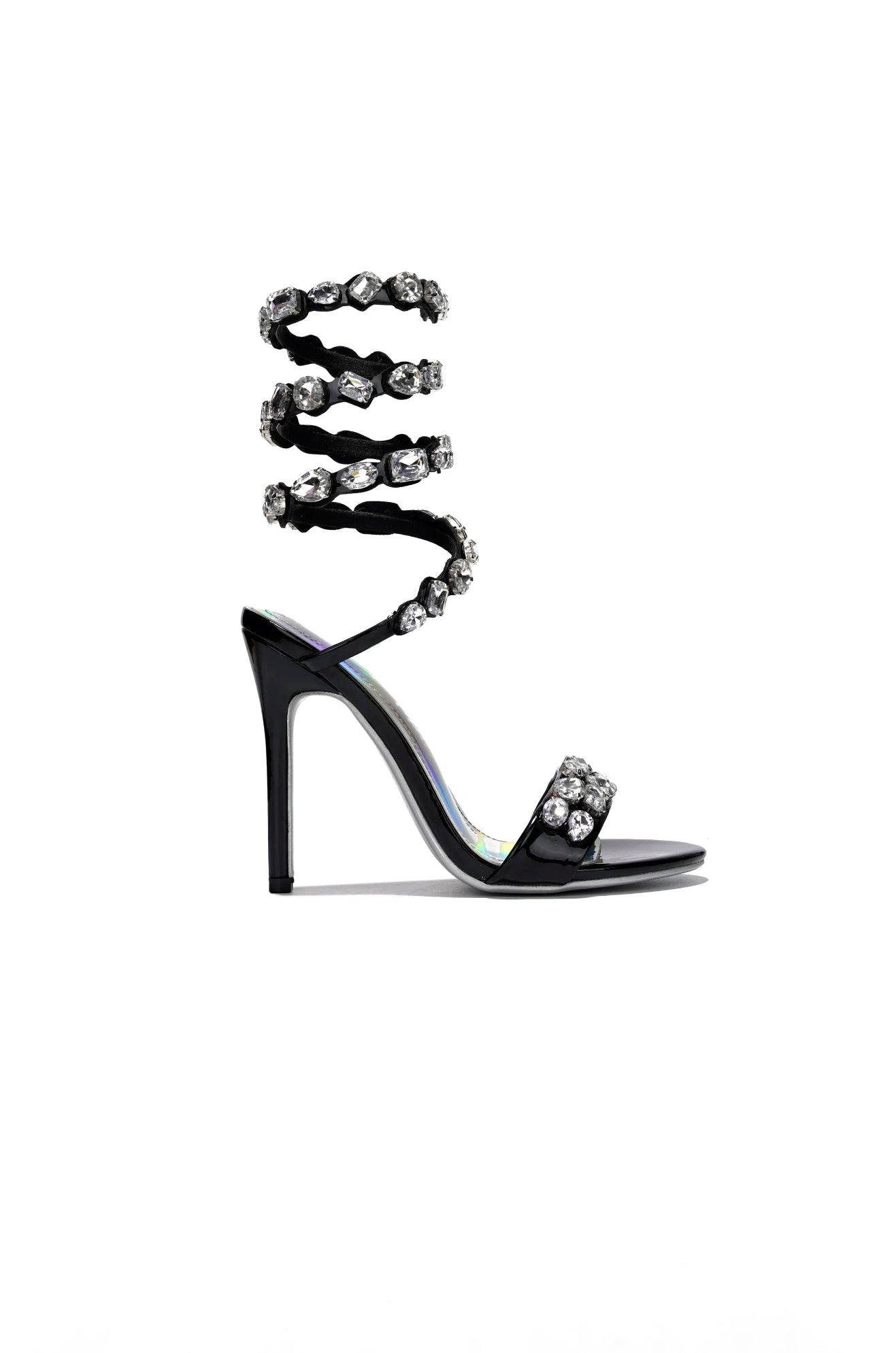 Elevate your style with Helia - Embellished Single Sole High Heels. These stunning heels feature an adjustable spiral coil strap for a secure fit and a lightly padded insole for added comfort. Slip on entry and thin heels make them perfect for any occasion, and the embellished stone detailing adds a touch of glamour to your look. Heel height: 4.5".