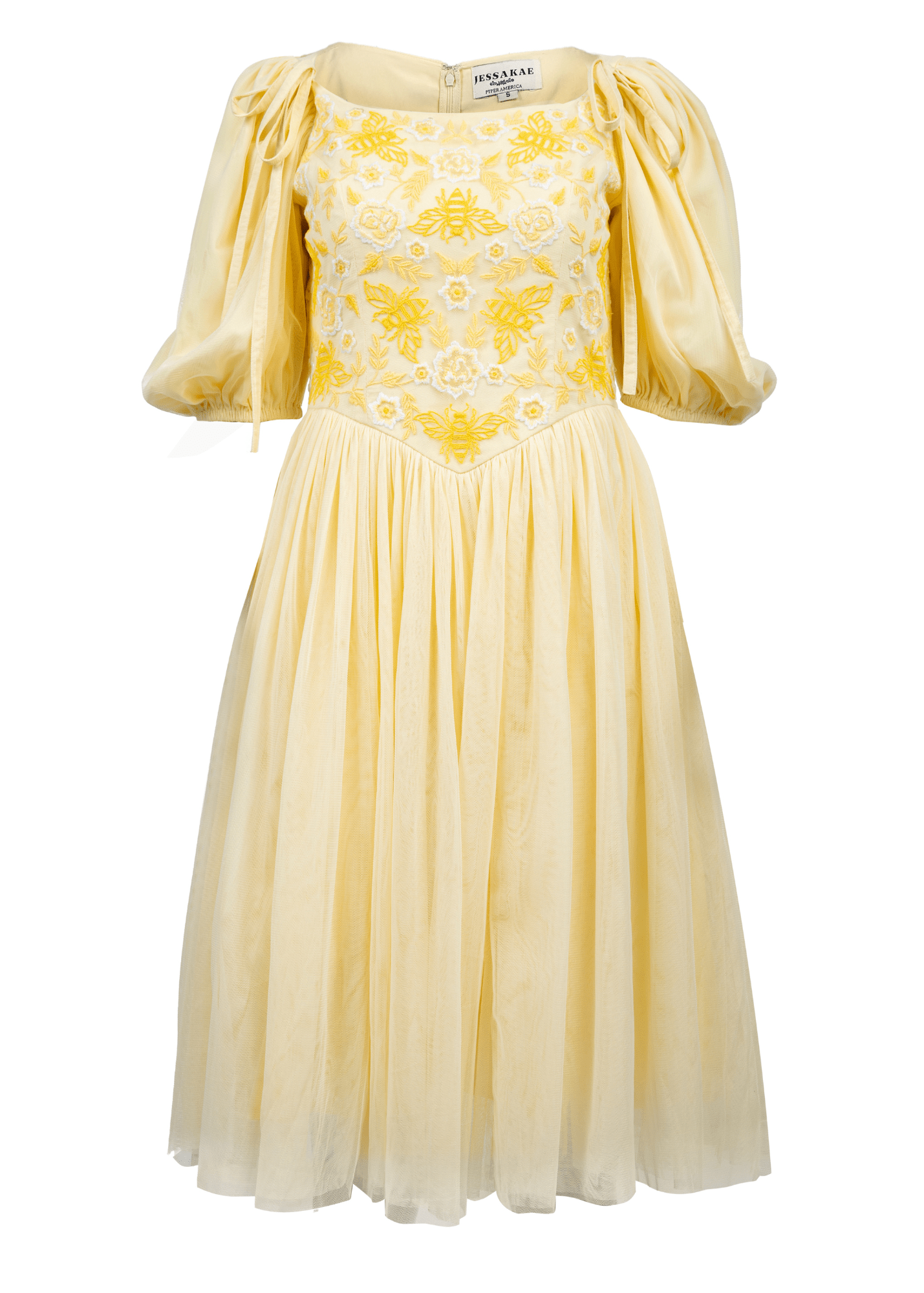 Add this new sweet and stylish dress to your wardrobe. The Honey Bee Dress features beautiful golden-yellow fabric, bee floral embroidery, a princess waistline, and lantern puff sleeves. This dress will have you buzzing with delight!
