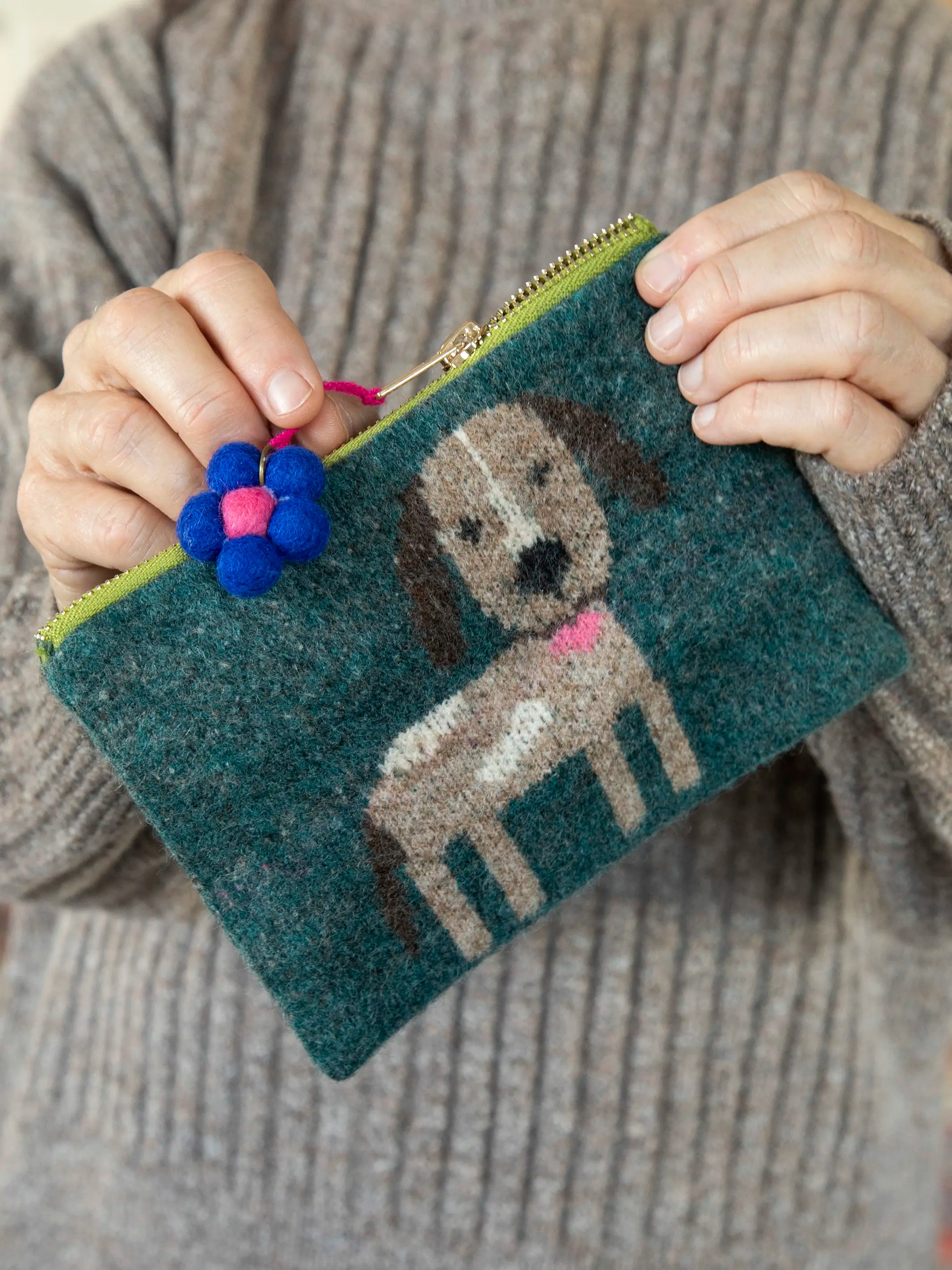 We're obsessed with intarsia and were thinking, what else can we make?! So we made this ADORABLE pouch! Use it alone or toss it in your tote bag!