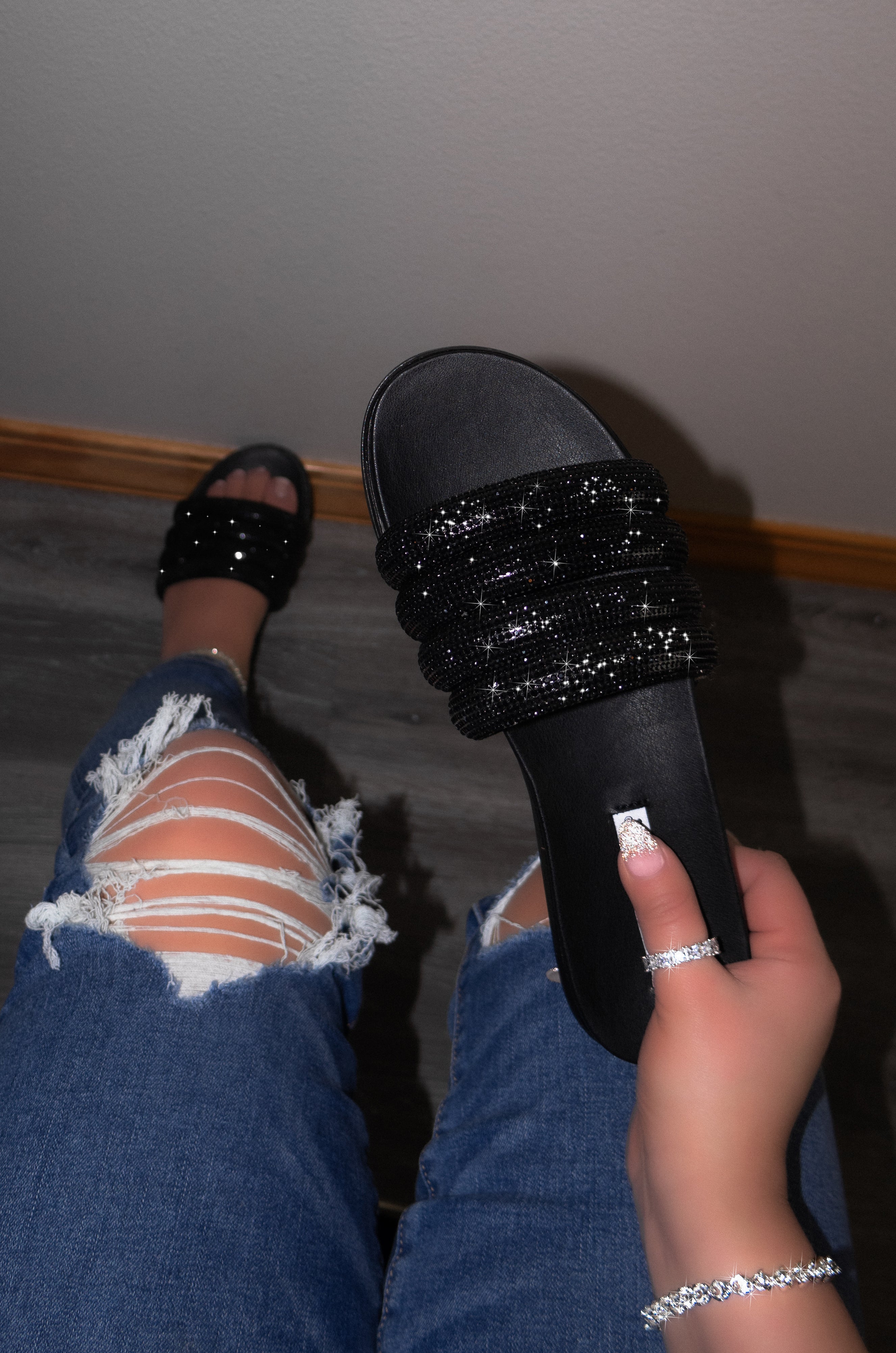 Elevate your style with Kilter - Embellished Strap Sandals. Featuring lightly padded insoles and open rounded toes, these slip-on sandals offer all-day comfort. The rhinestone detailing on the embellished straps adds a touch of glamour to any outfit. True to size, effortless to wear, and perfect for fashion-forward individuals.