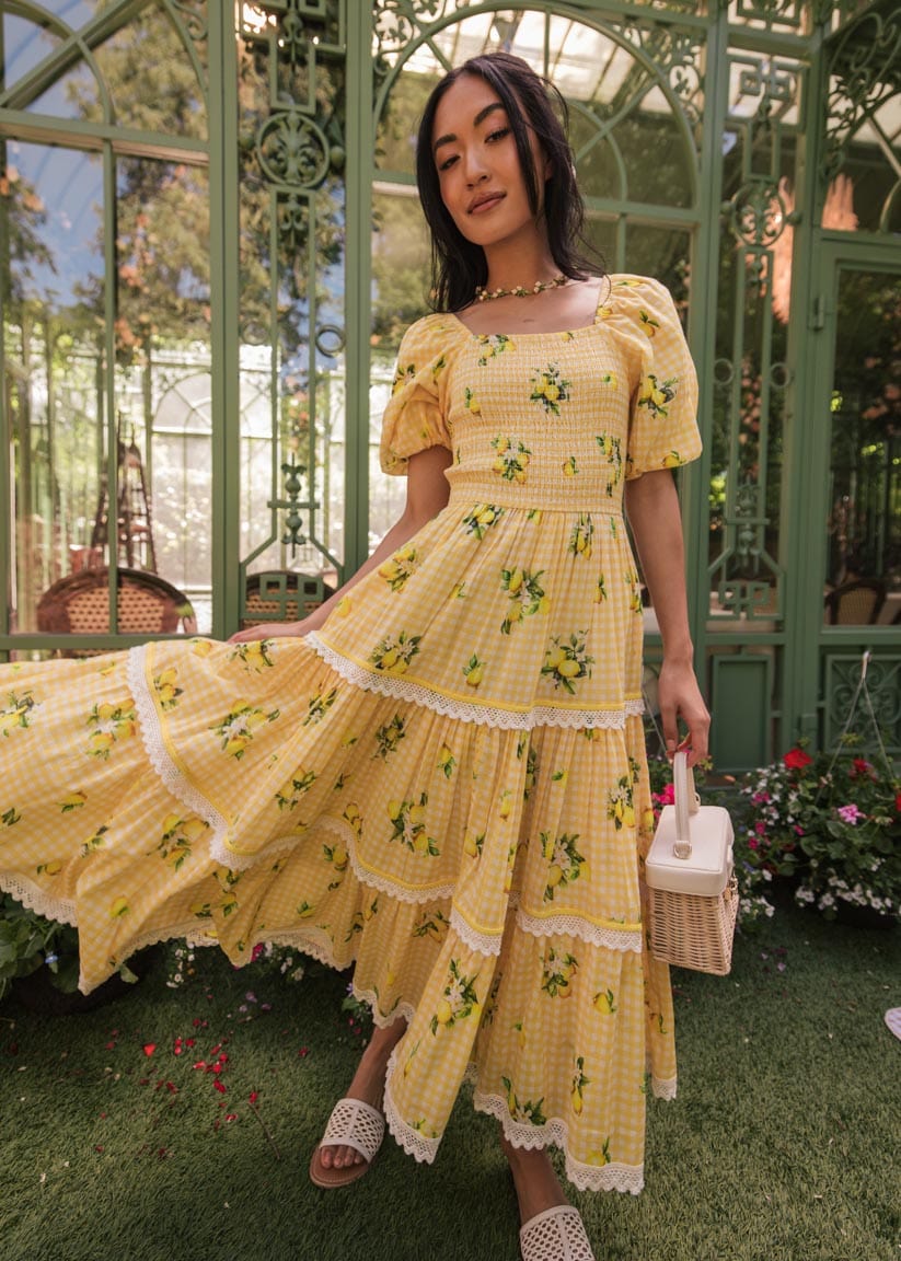 This lemon-printed midi was made for summer in its adorable yellow gingham. The flirty design and playful fabric make it a delightful choice for picnics, garden strolls, or any sunshine-filled adventure.