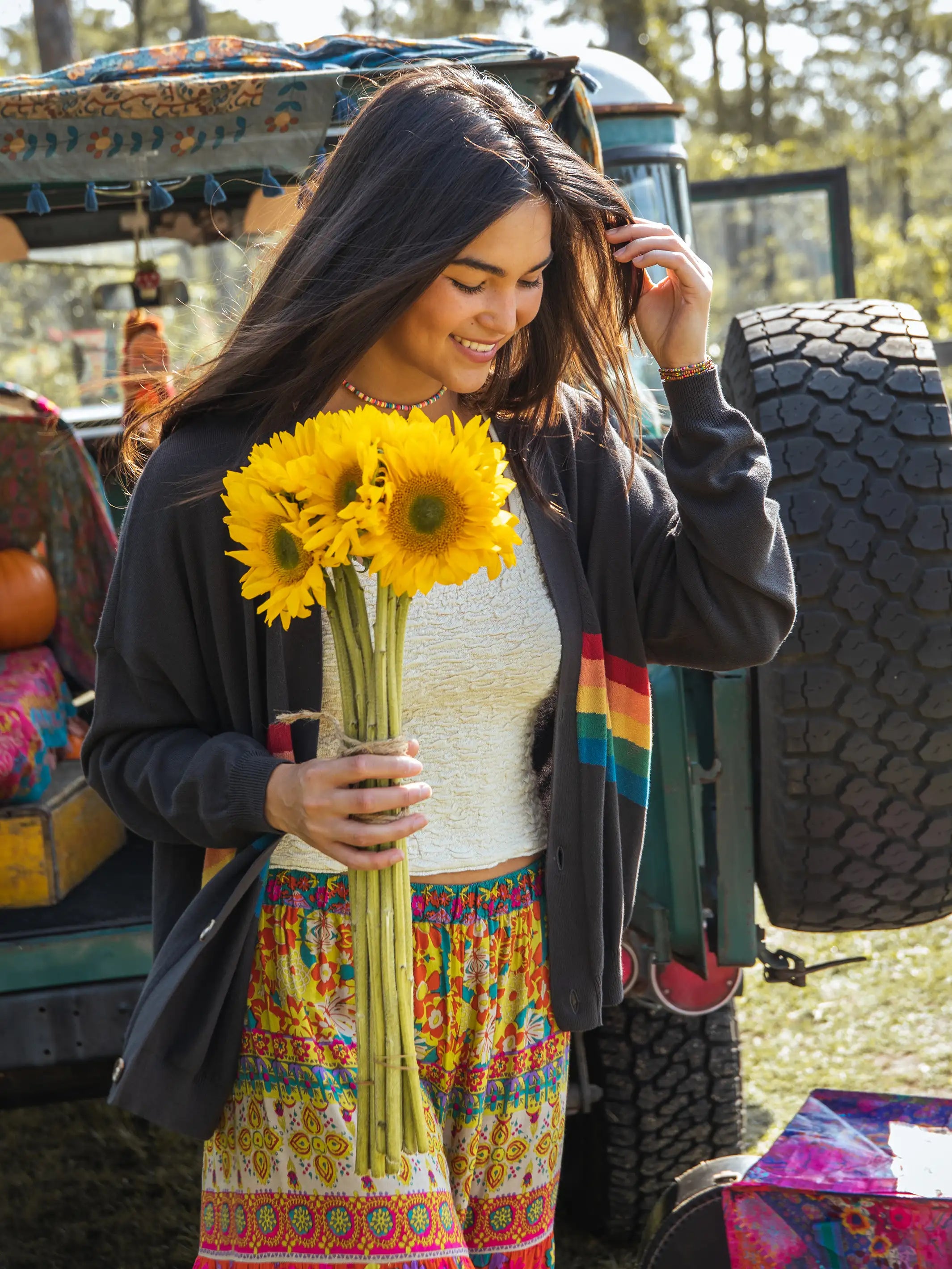 Live Happy Cotton Cardigan Sweater - Charcoal Rainbow