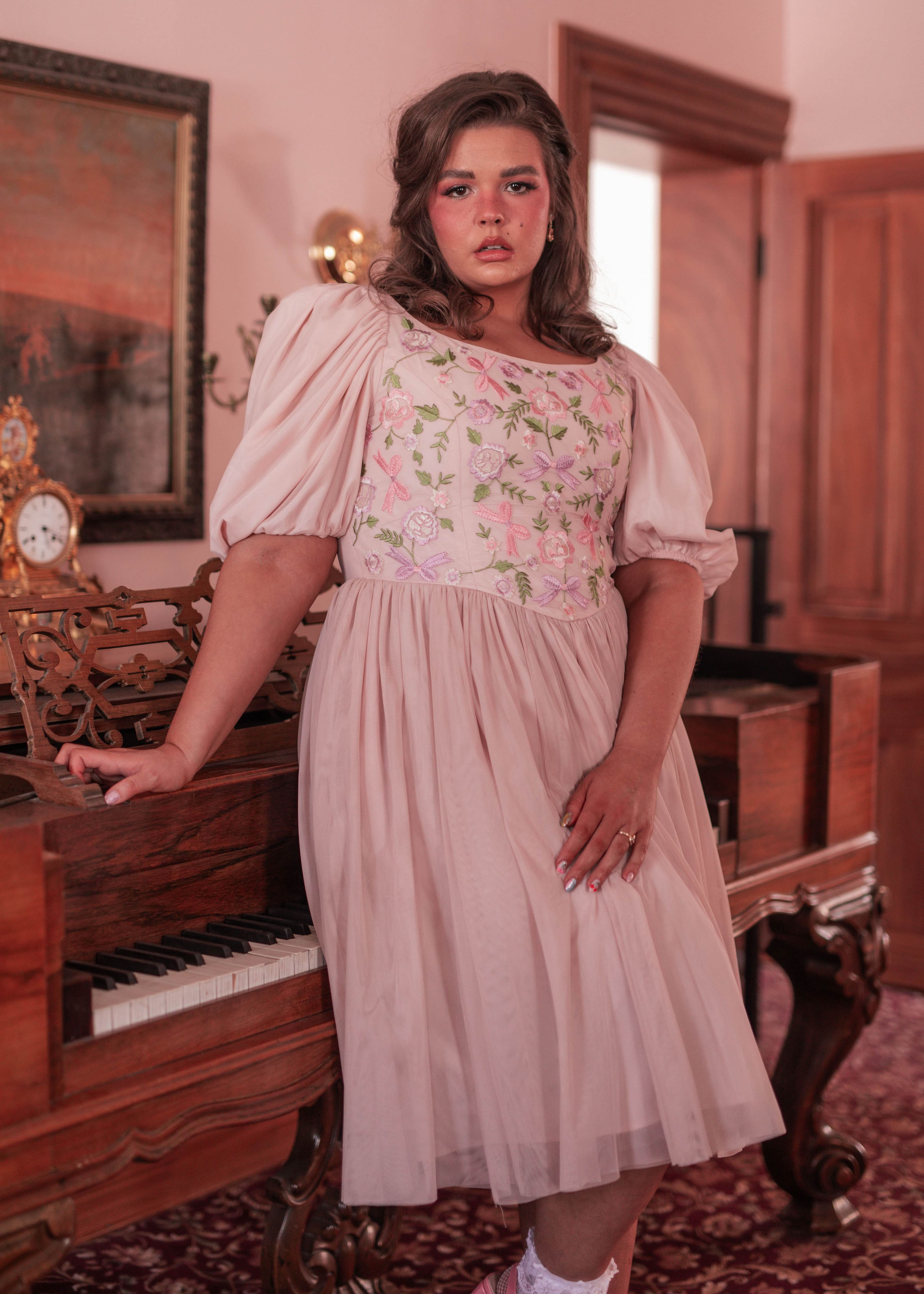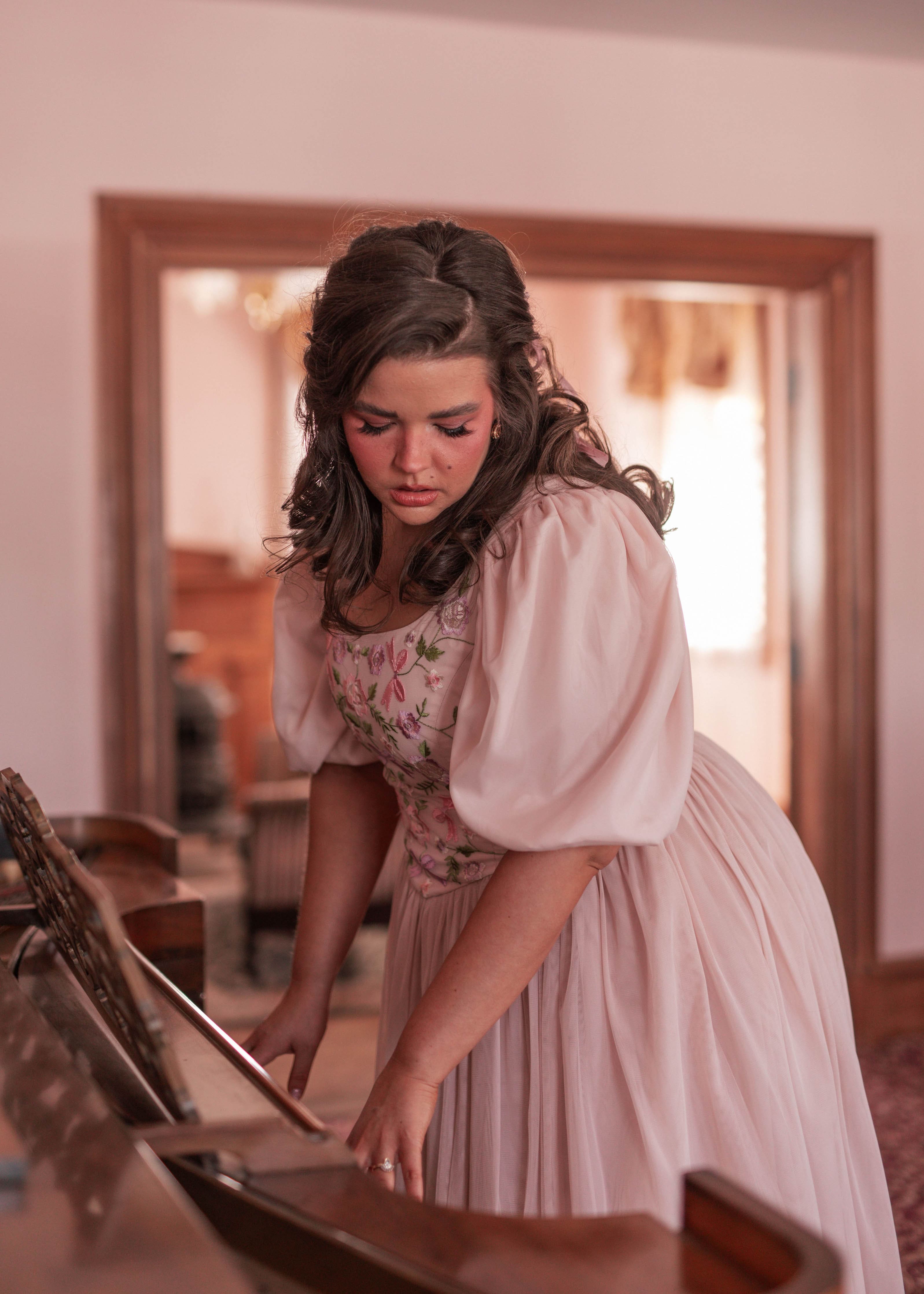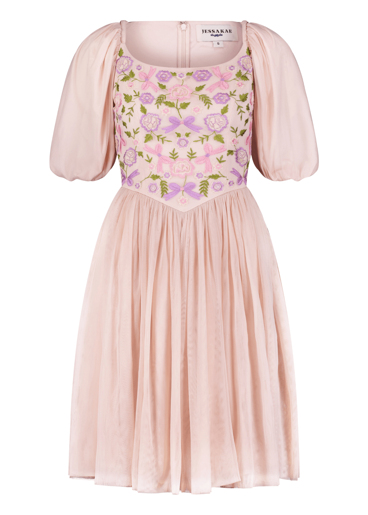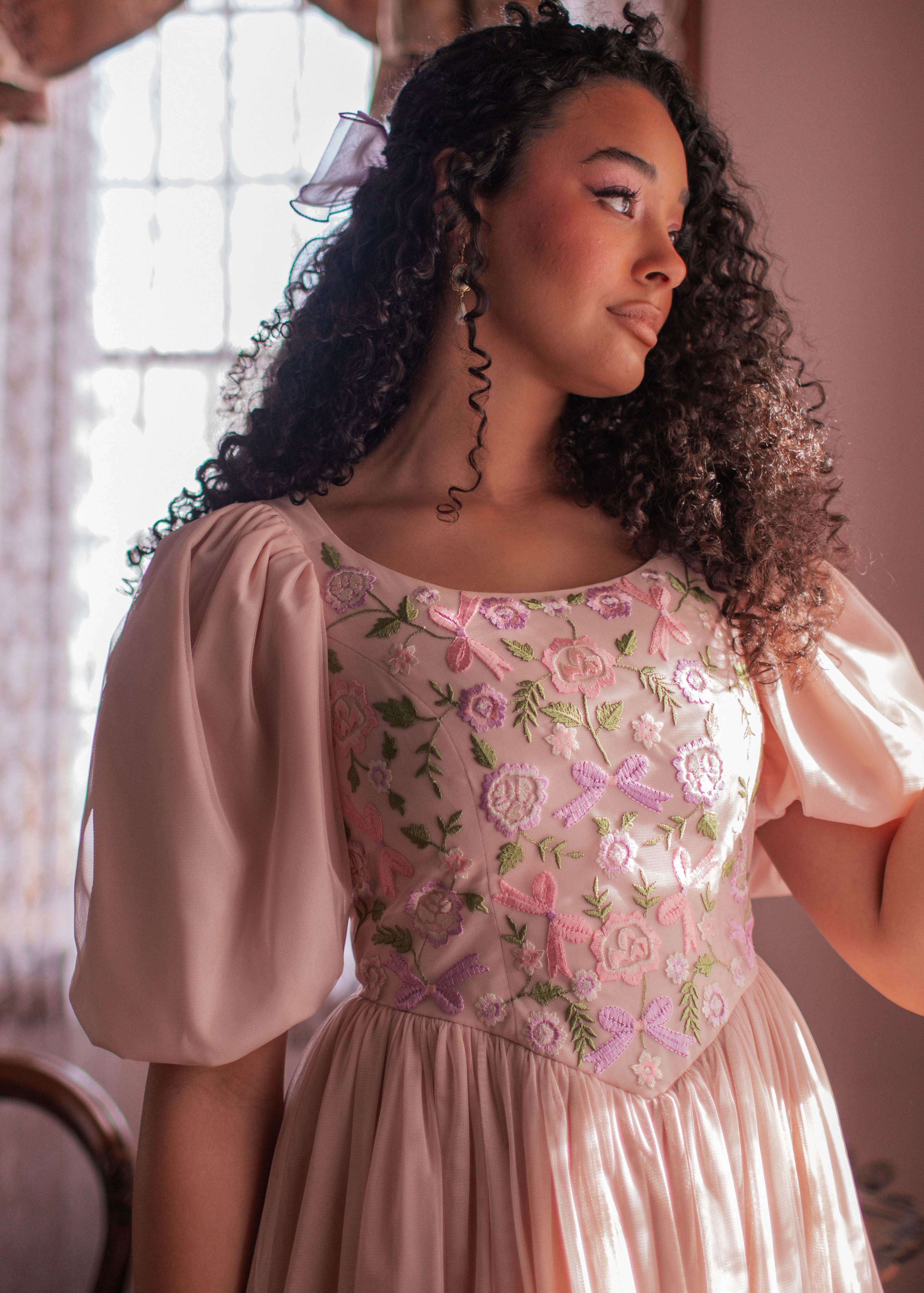 Inspired by bows, ballets, and French pastries. The Macaron Dress is an exquisite combination of pink and purple hues, creating a captivating palette that mirrors the delicate beauty of blooming flowers. The dress is a celebration of femininity, with its flowing silhouette and charming details that echo the grace of a fairytale princess.