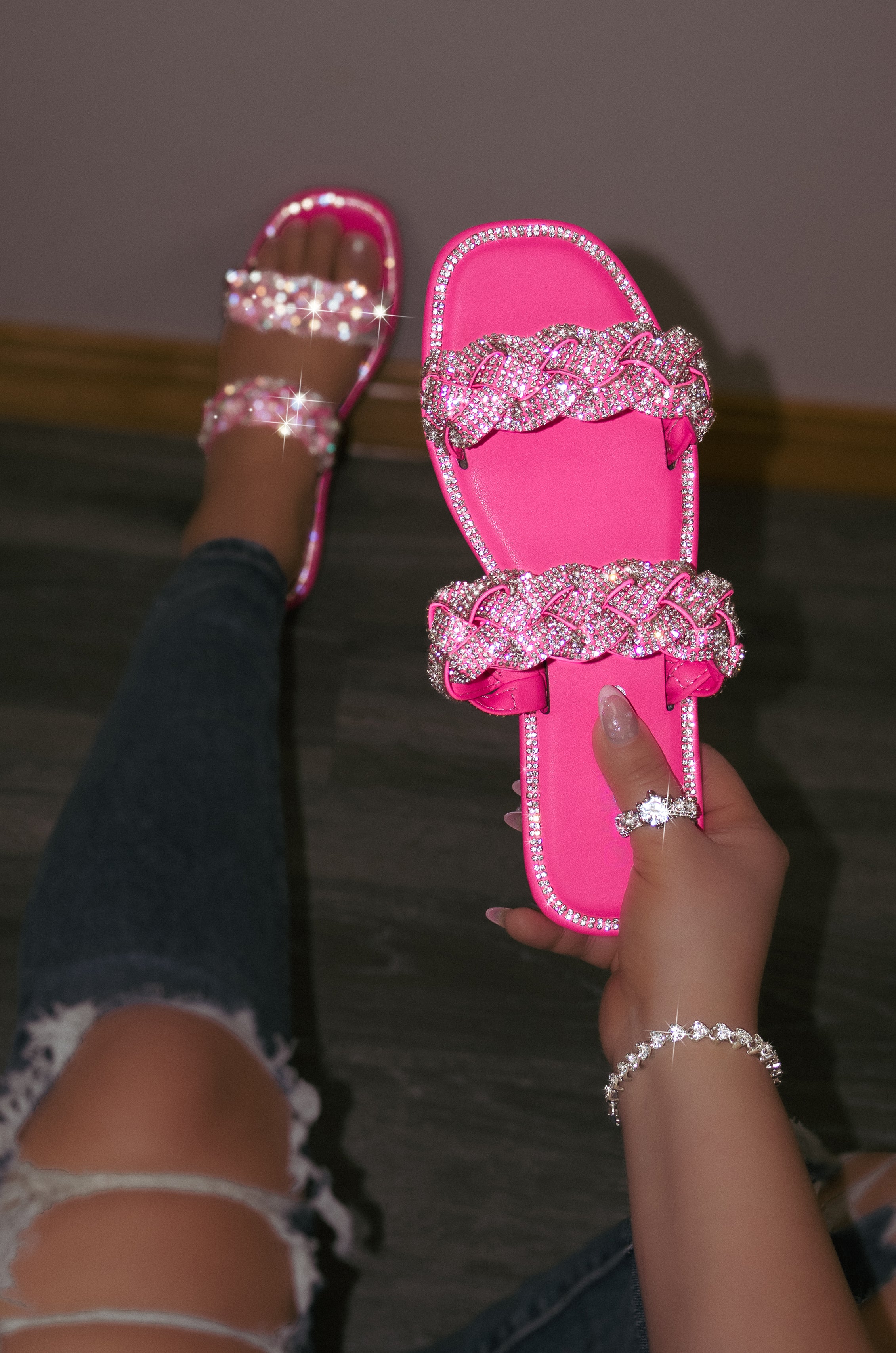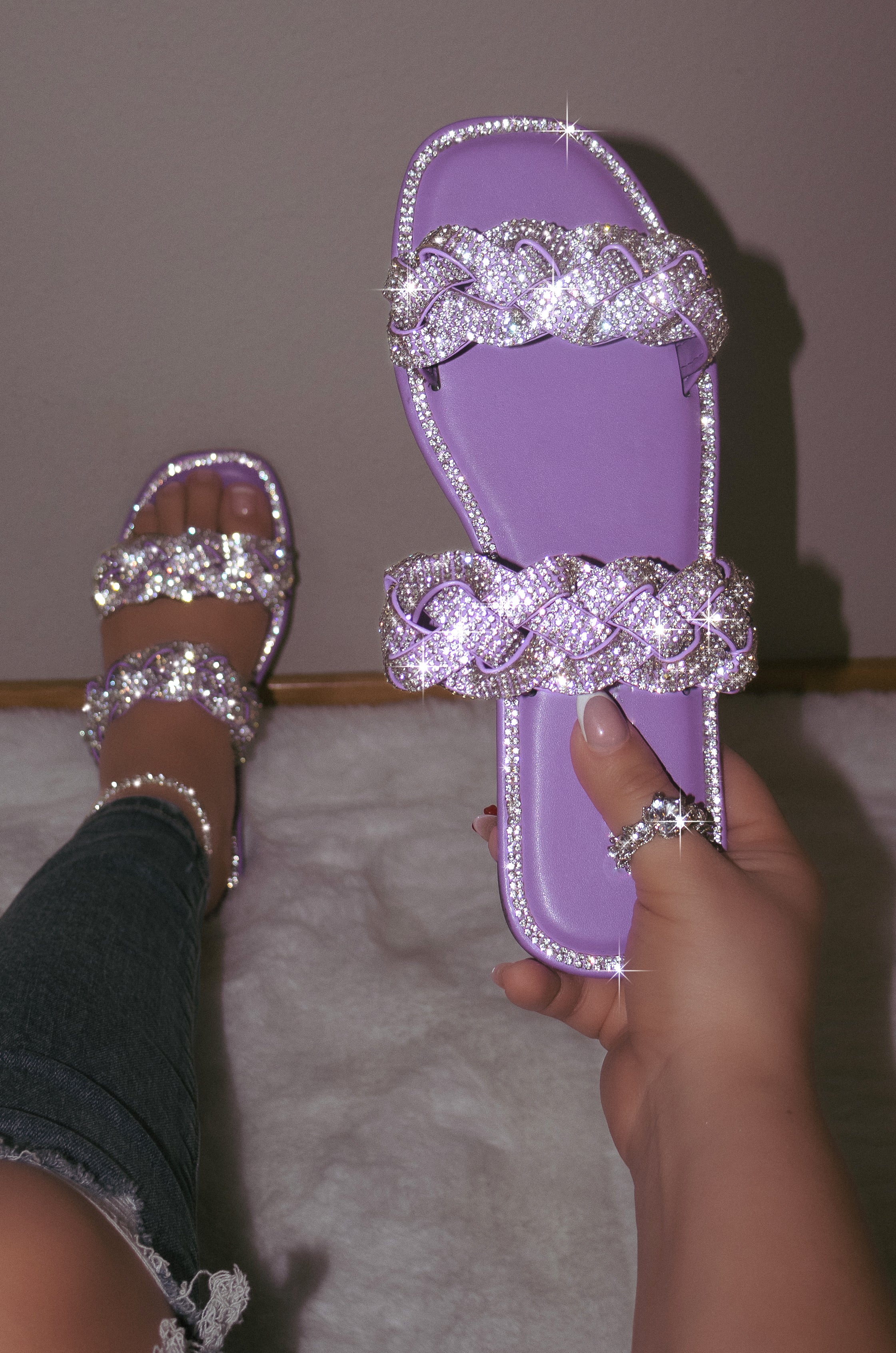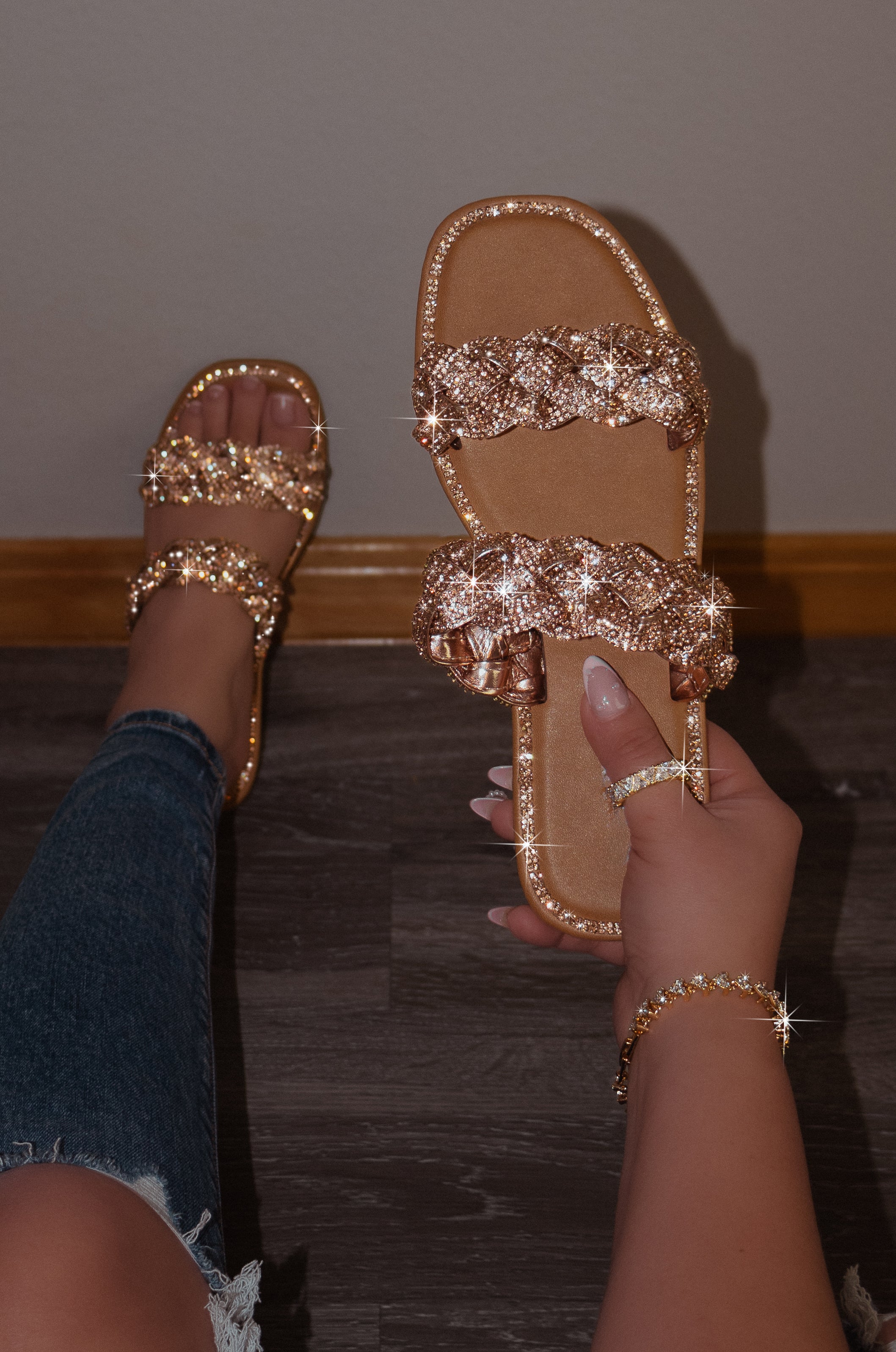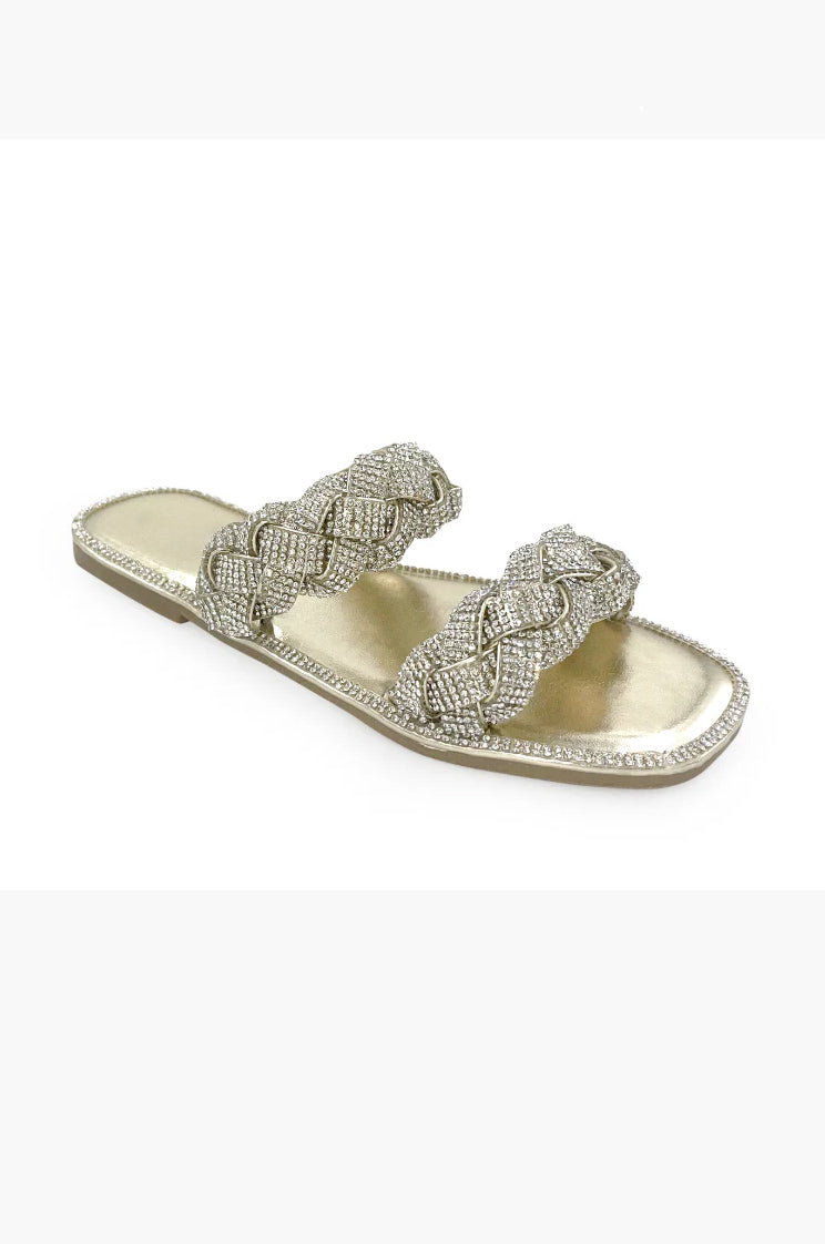 Sparkle like never before in the Maddy sandals! Imbued with double embellished straps and a shiny rhinestone detailing, it is the perfect addition to your summer wardrobe. Whether you're going for a casual lunch or a night out, these flat sandals are designed for all occasions. Slip it on for a comfortable fit all day long with the lightly padded insole. Let the stars align with Maddy!