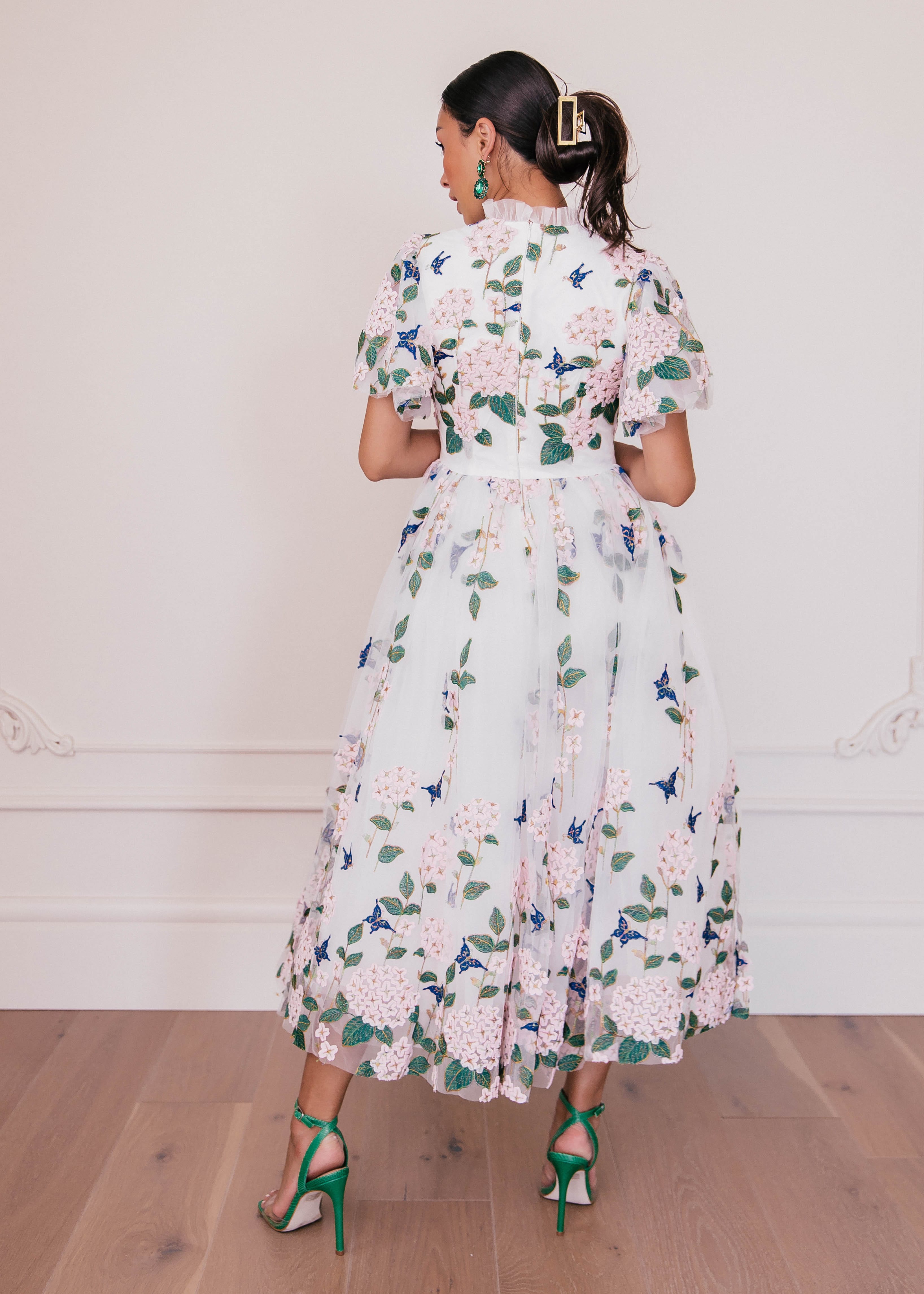 This beautiful and delicate floral embroidery dress is a statement piece for any occasion. The sheer flutter sleeves and fitted waistline create a feminine silhouette, while the ruffles along the neckline are fun and flirty. Hidden back zipper for on-and-off ease.