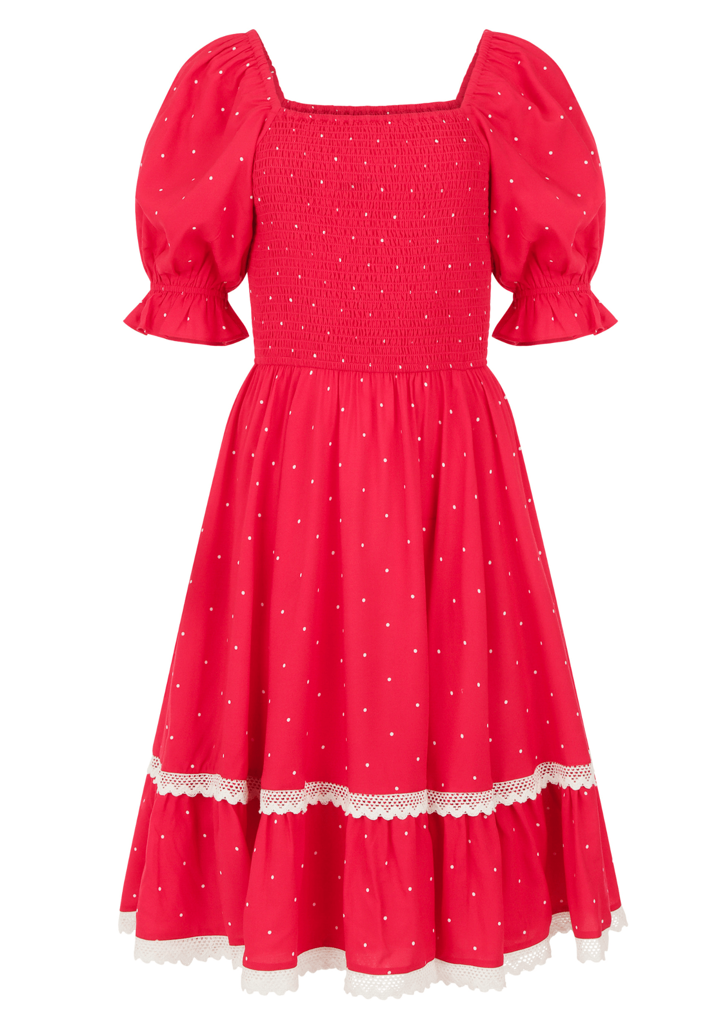 The Minnie Dress is a lively blend of classic charm and playful style! Featuring puff sleeves, lace trim, and a flattering smocked bodice, this dress offers a comfortable fit with a touch of feminine magic! Whether dressing up for Halloween or adding a bit of fun to your wardrobe, the Minnie Dress is the perfect choice for any festive occasion!