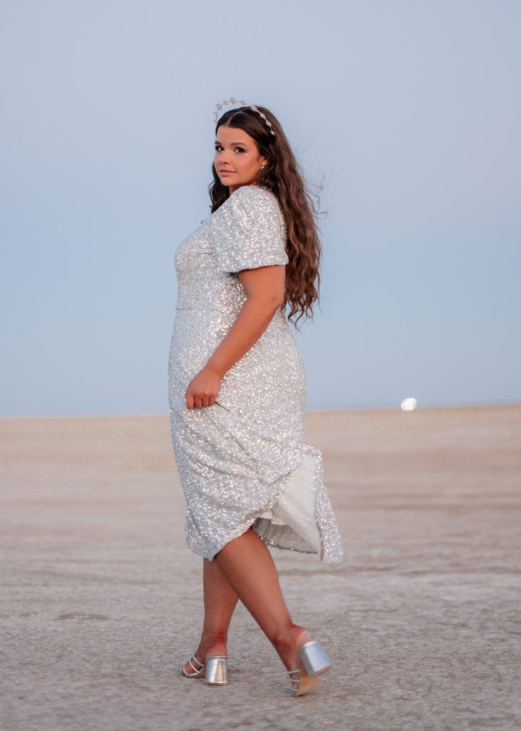 The Nova Dress is the ultimate showstopper for any party. Its shimmering silver sequins catch the light with every move, ensuring you sparkle all night long. The classic silhouette, featuring short sleeves and a flowing midi-length skirt, makes it both elegant and comfortable. Shop this perfect party look for a night to remember!