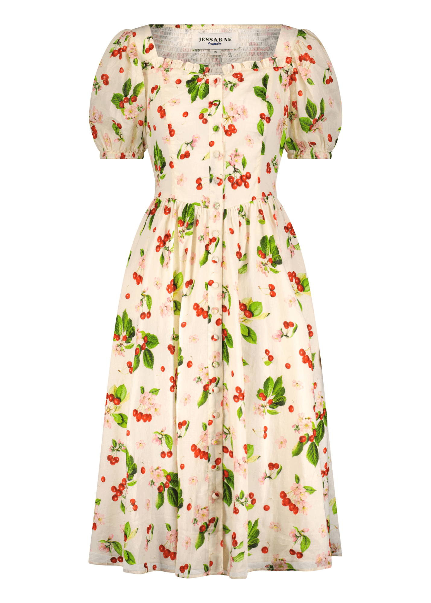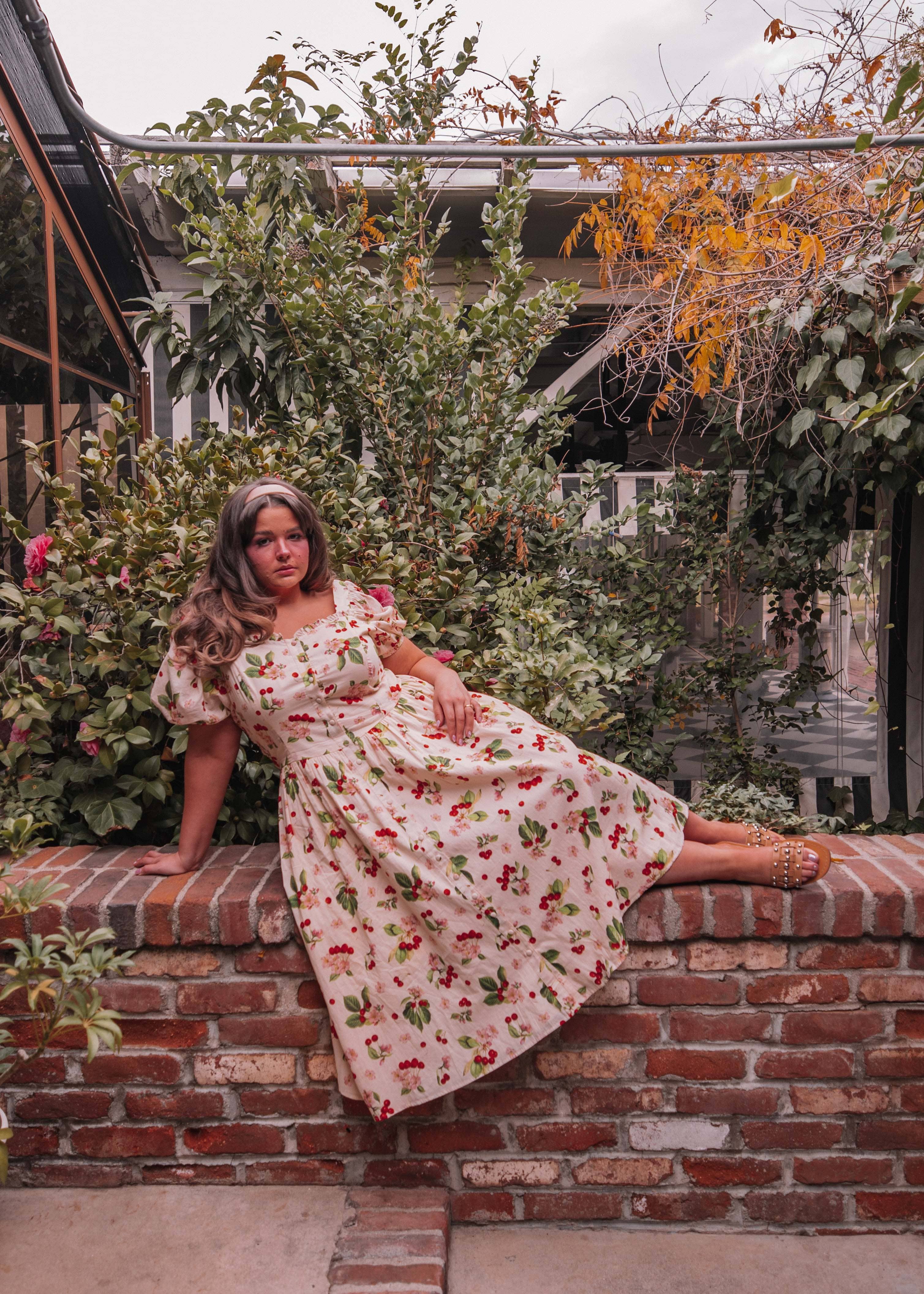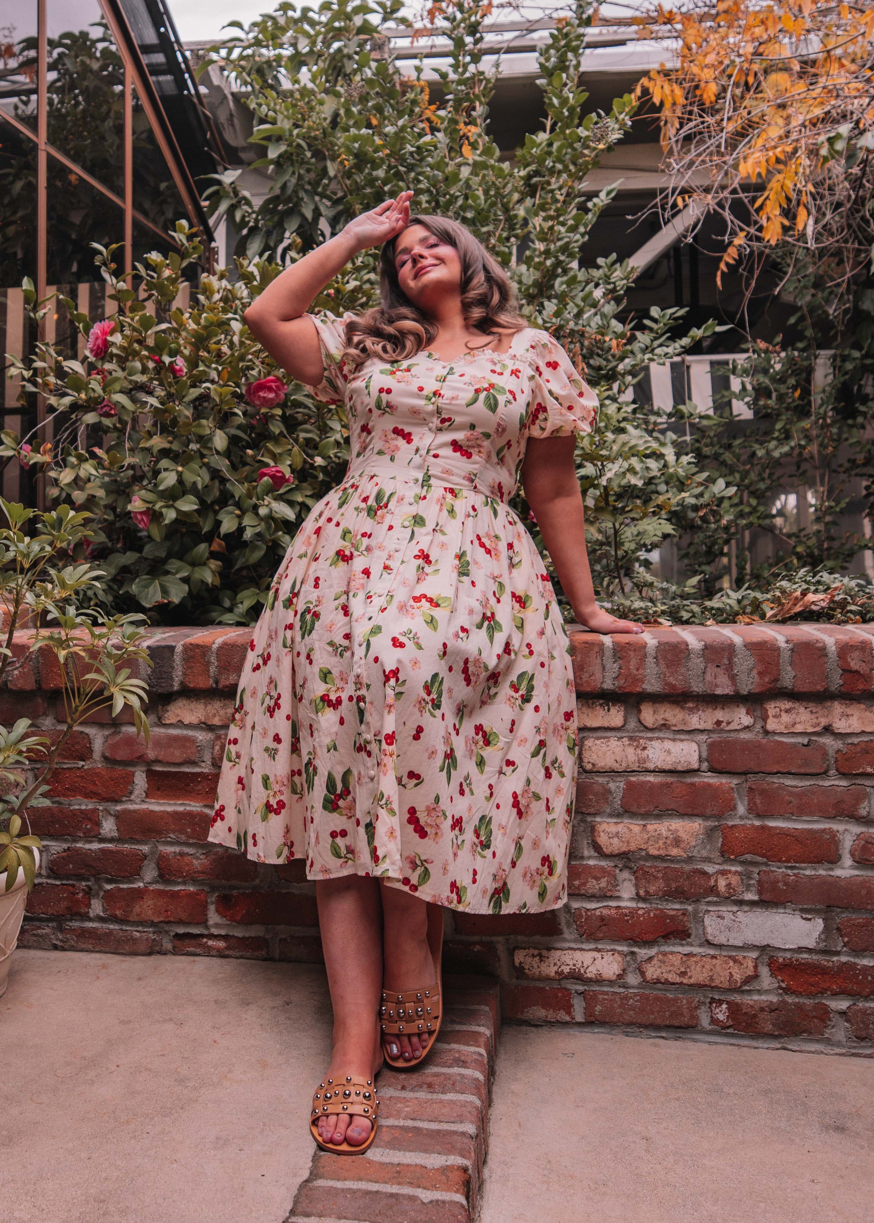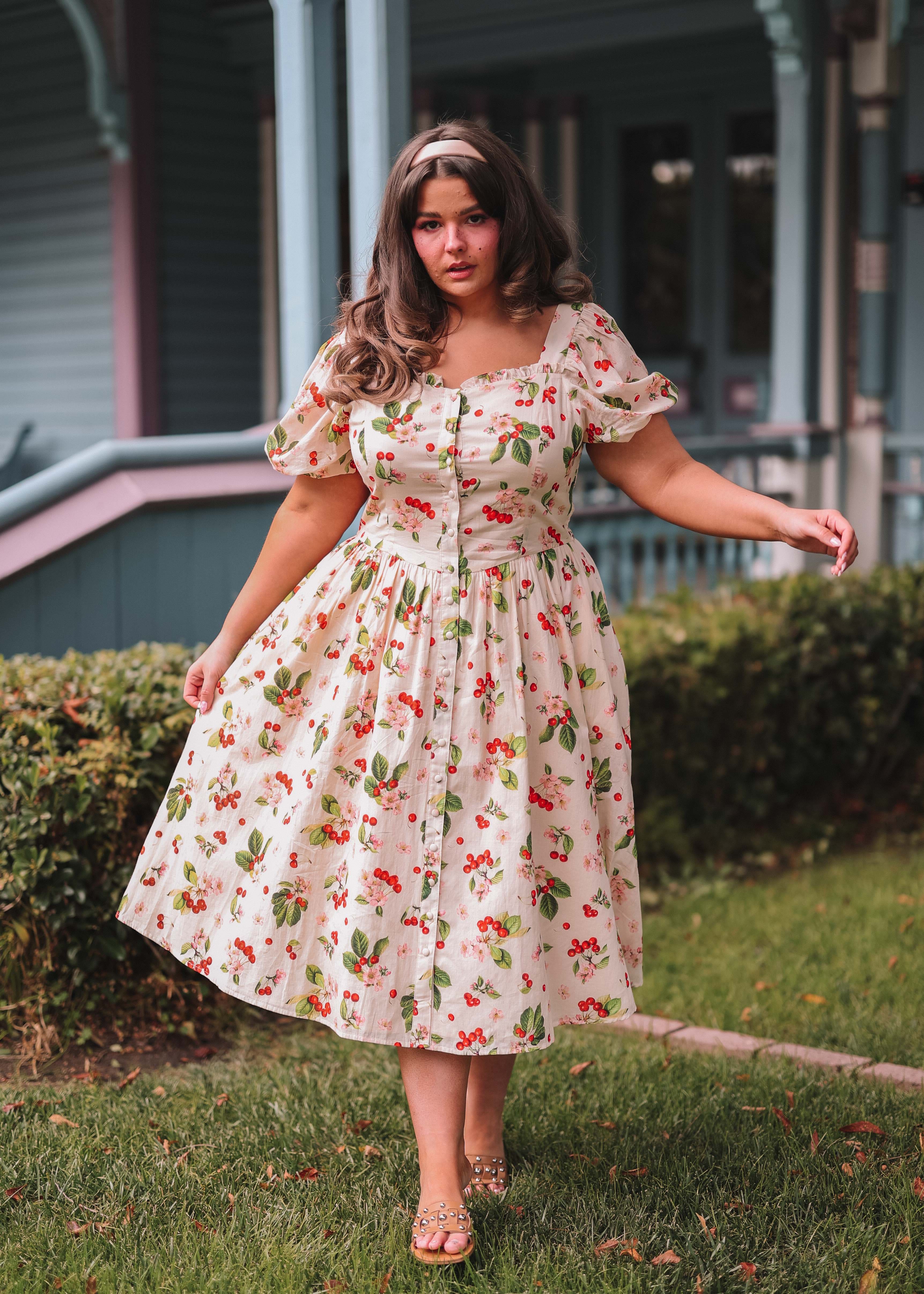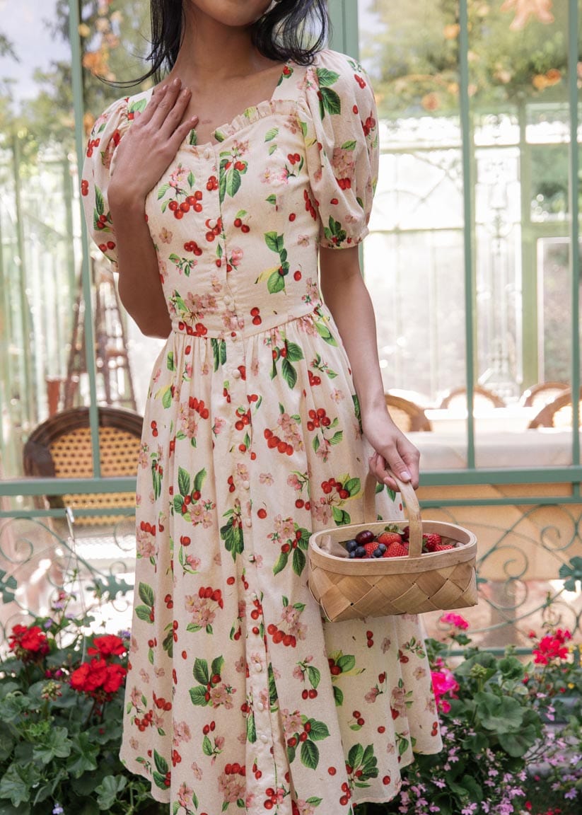 This dress is a celebration of all things lovely and lively. Its breezy design and gentle hues will make you feel like you're strolling through a picturesque orchard, feeling the warmth of the sun and the joy of the season. Let this cherry ensemble be your companion for picnics, garden parties, or simply for bringing a burst of cheerful style to any day.