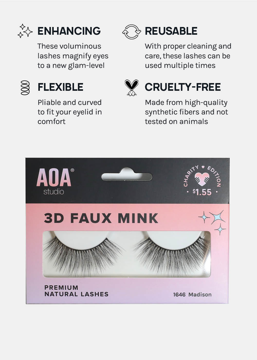 These lashes are vegan, cruelty-free, and made from synthetic fibers. The band is thicker, therefore can be reused multiple times with proper care and cleaning!