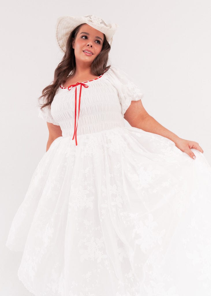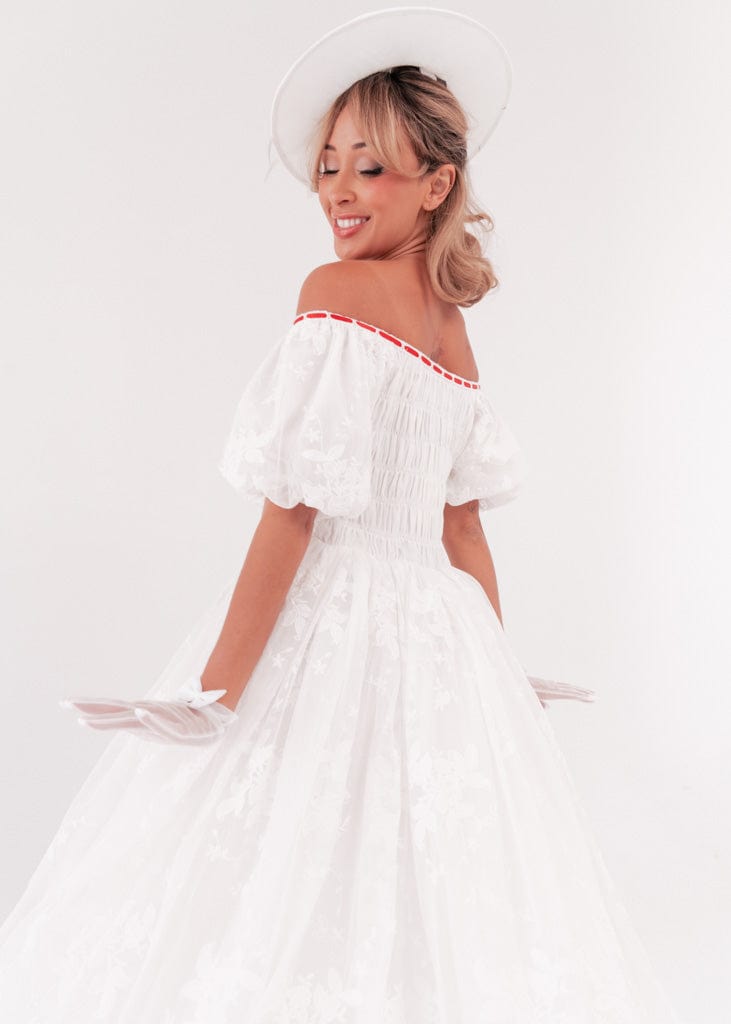 The Poppins Dress is a nod to vintage elegance and the essence of everyone's favorite magical nanny! The crisp white fabric is adorned with floral details that are beautifully contrasted by a bold red trim and delicate bow - adding a pop of color to this classic silhouette. With its flattering off-the-shoulder fit and playful puff sleeves, this dress exudes sophistication. Whether dressing up for Halloween or out for a magical adventure, this ensemble can only be described as practically perfect in every way!