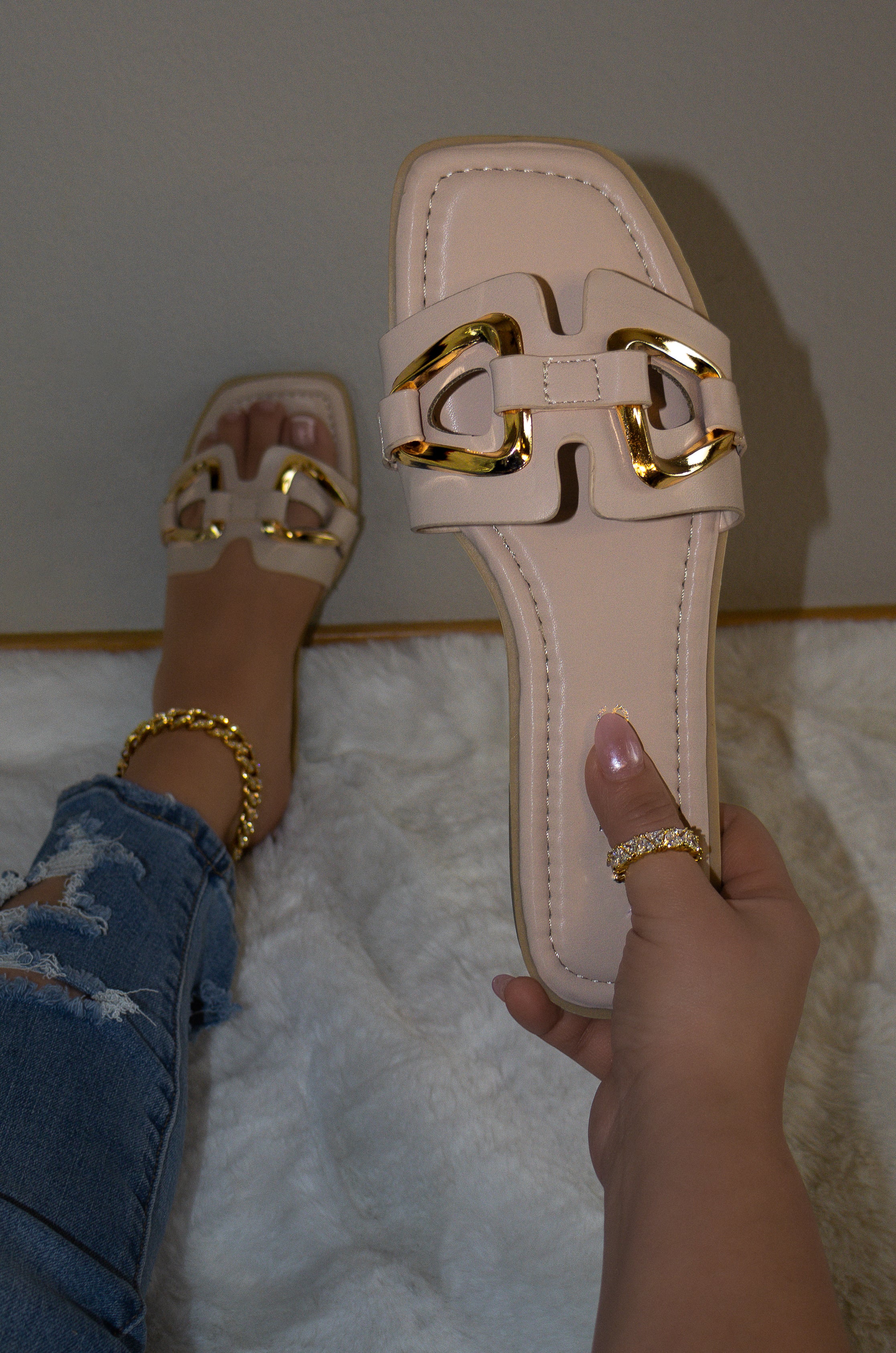 Introducing Regina, the perfect blend of fashion and comfort. Slip on these square toe sandals and feel the lightly padded insole support your every step. The gold-tone detailing adds a touch of elegance, making these the perfect choice for any occasion. Available in true-to-size fit.