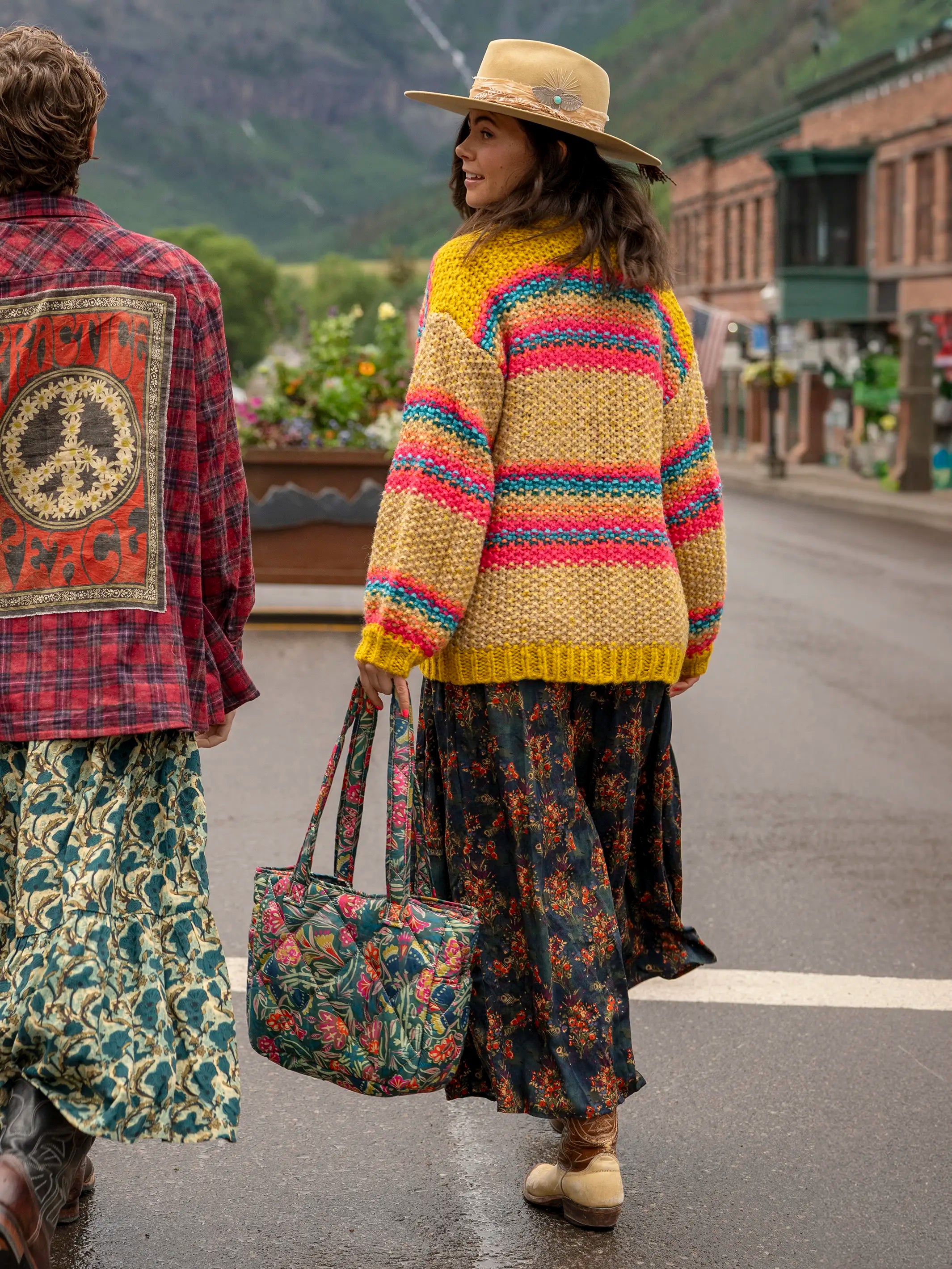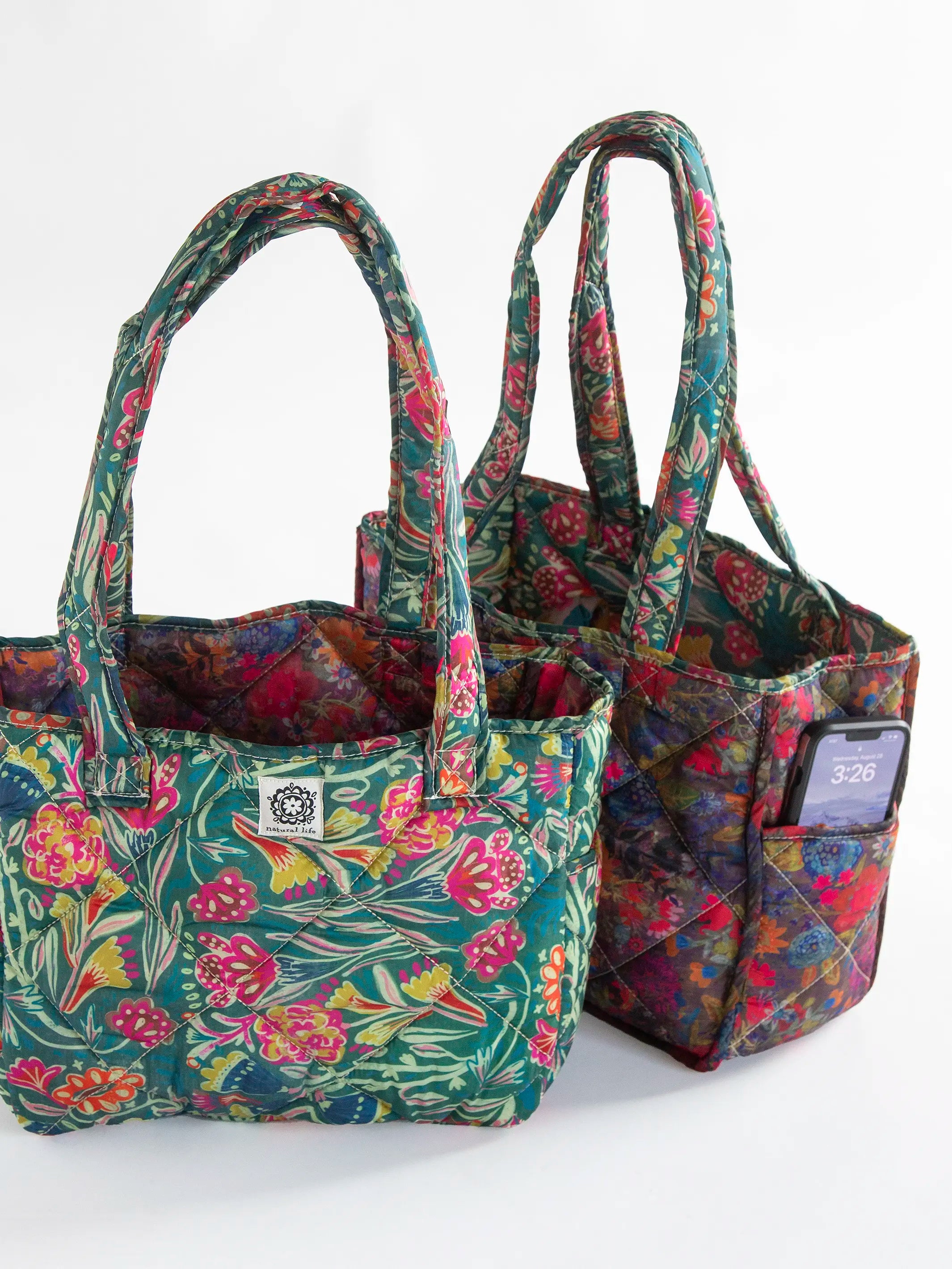 Reversible Puffy Tote Bag - Medium Green Lined Floral