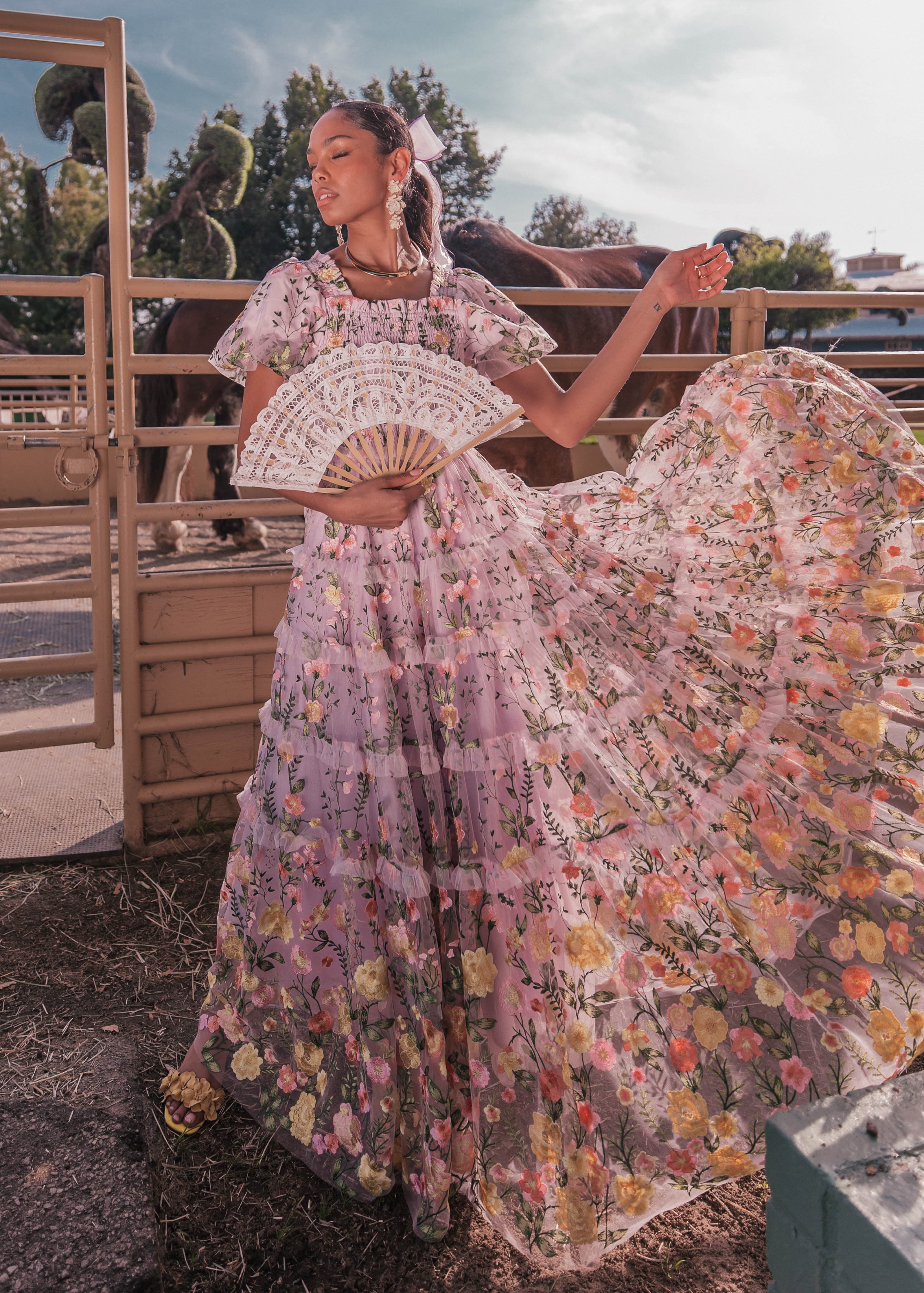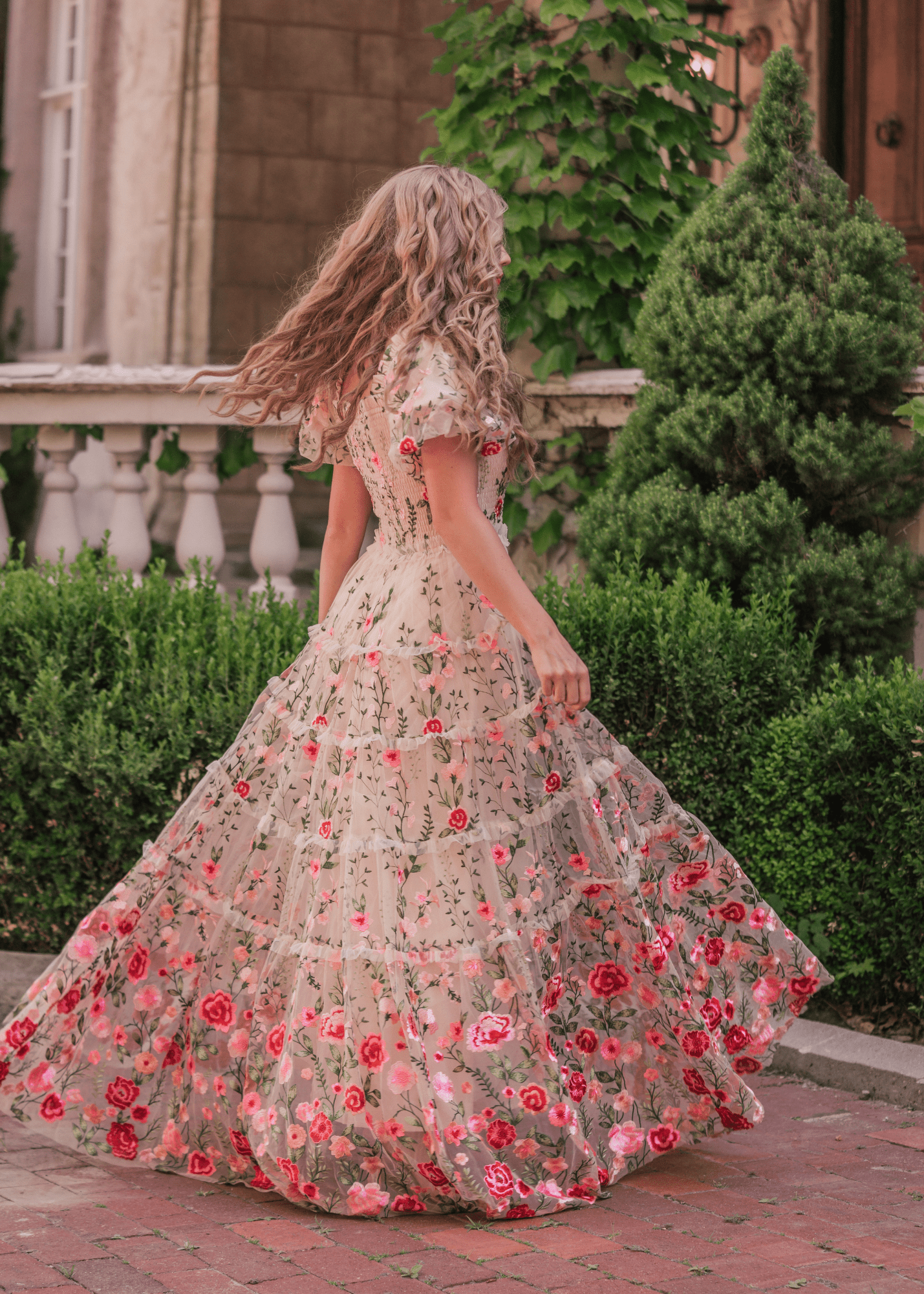 The Rose Dress is a stunning piece that will transport you to a world of whimsy and romance. Pink/yellow roses and elegant ruffles cascade down the skirt, adding a touch of femininity and movement to every step.