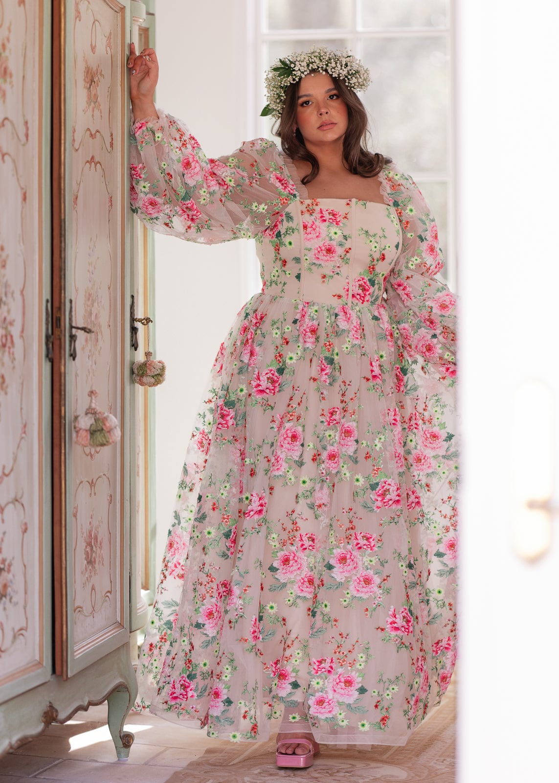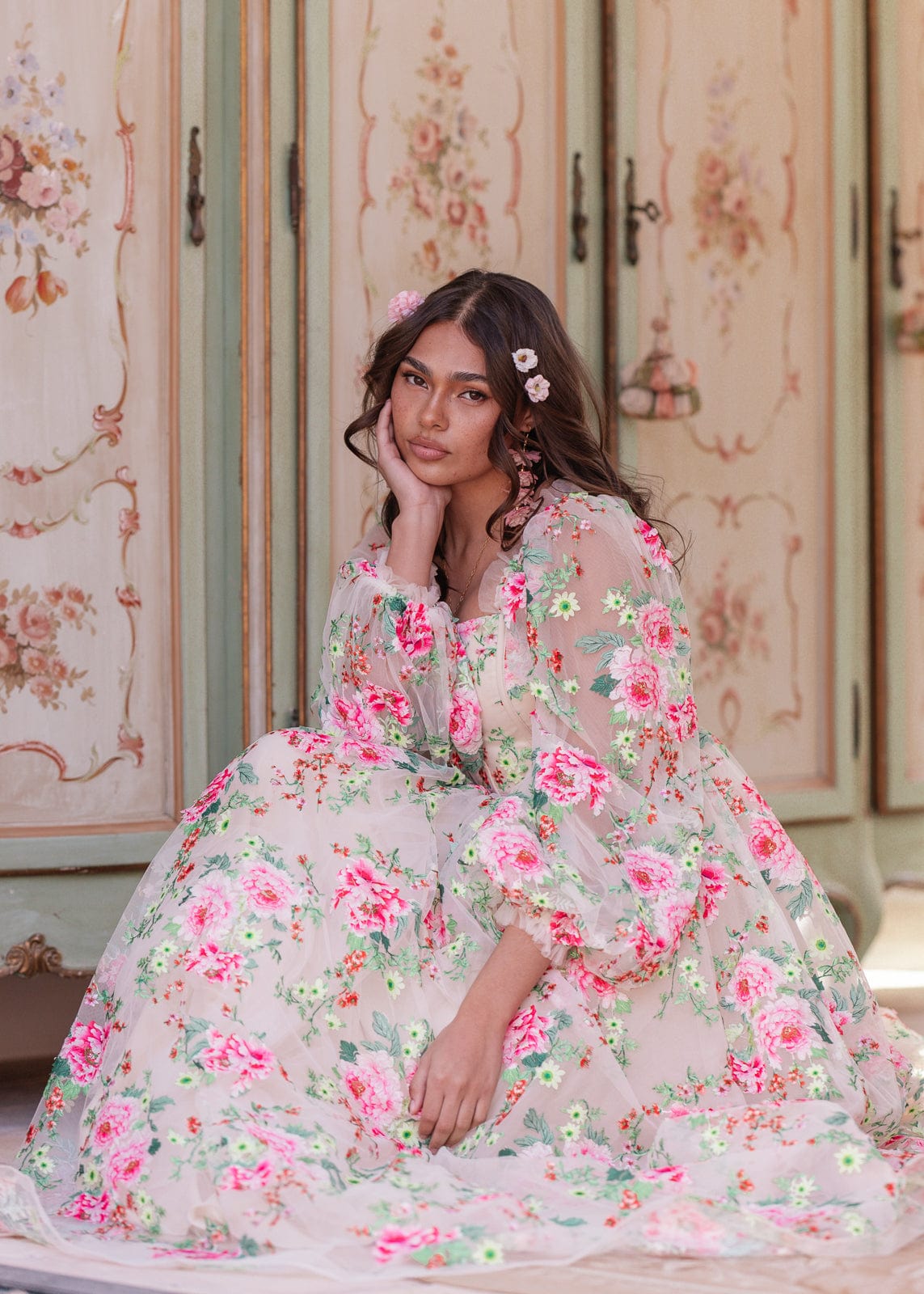 Step into a floral daydream with the Rosetta Dress, a breathtaking blend of romance and elegance. Featuring a soft, cream-colored base adorned with delicate pink roses and lush green accents, this gown is a vision of timeless beauty. Billowy puff sleeves and a structured corset-style bodice create a dreamy silhouette, while the flowing tulle skirt adds a touch of ethereal charm. Perfect for garden soirées, bridal events, or any moment that calls for a touch of vintage-inspired grace.