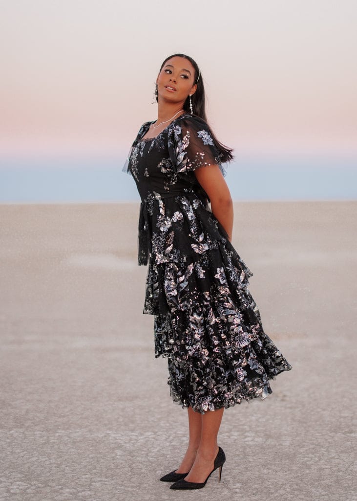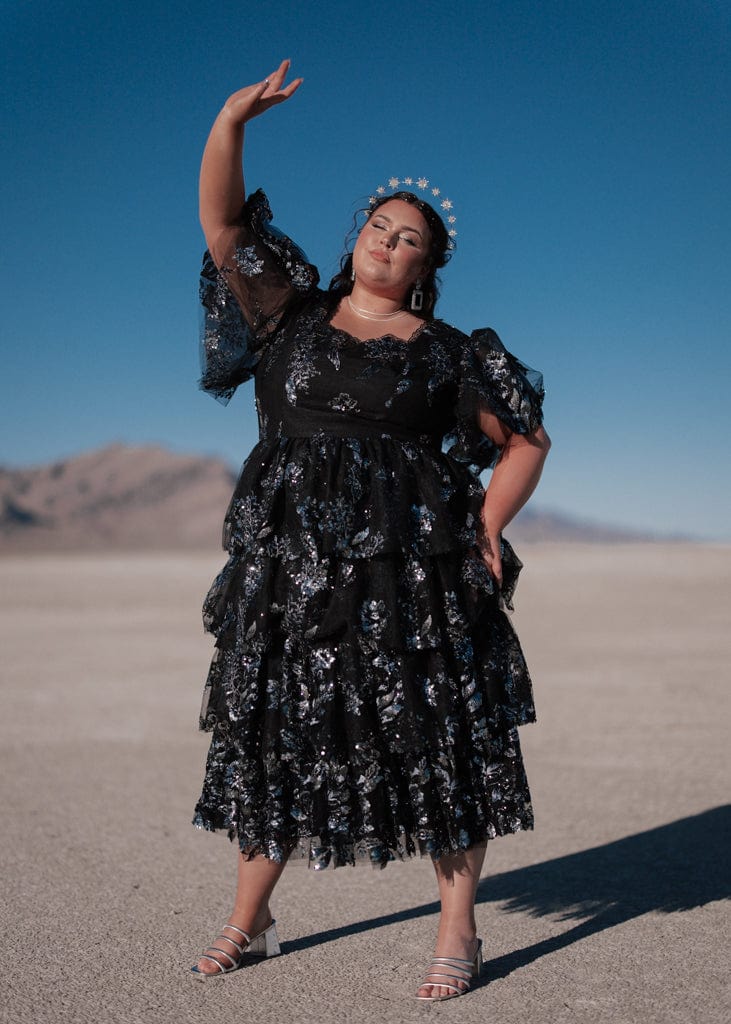 The Selena Dress is a stunning statement piece, featuring layers of shimmering black fabric adorned with silver floral detailing. Its flutter sleeves and tiered ruffles create a romantic, ethereal silhouette, perfect for making an entrance at any special event. With its square neckline and eye-catching sparkle, this dress is designed for those who want to outshine the stars one sequin at a time.