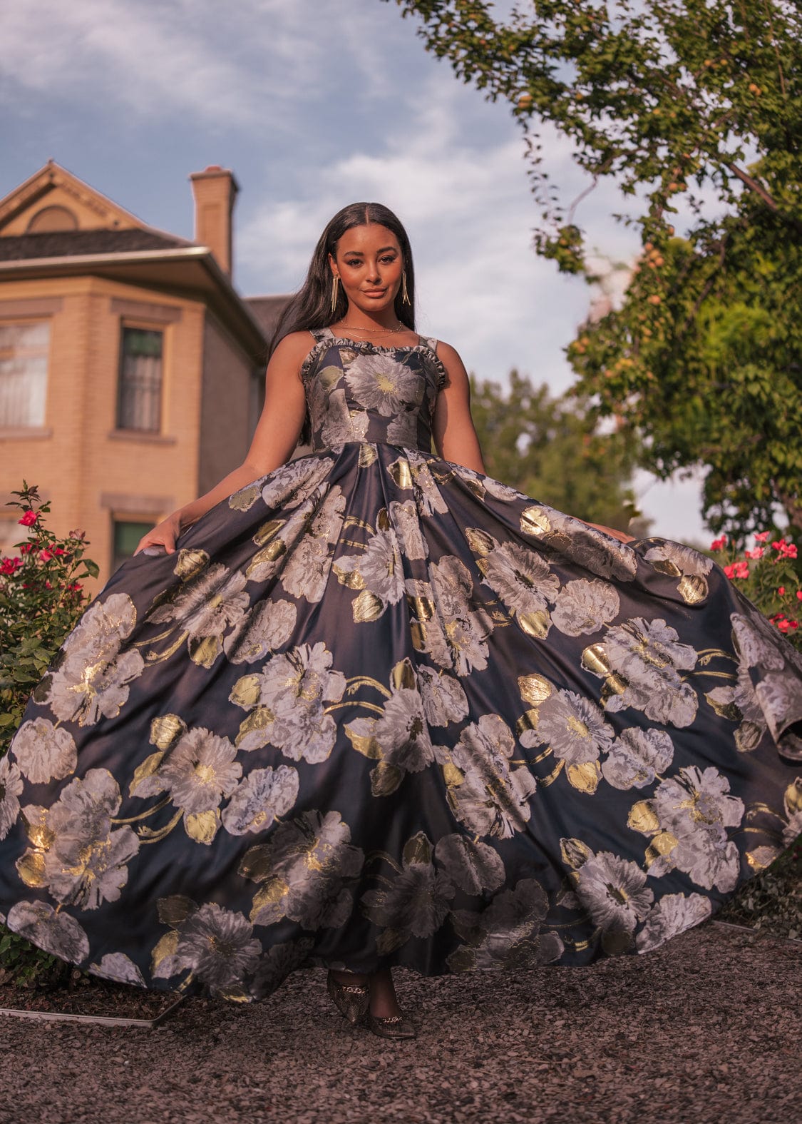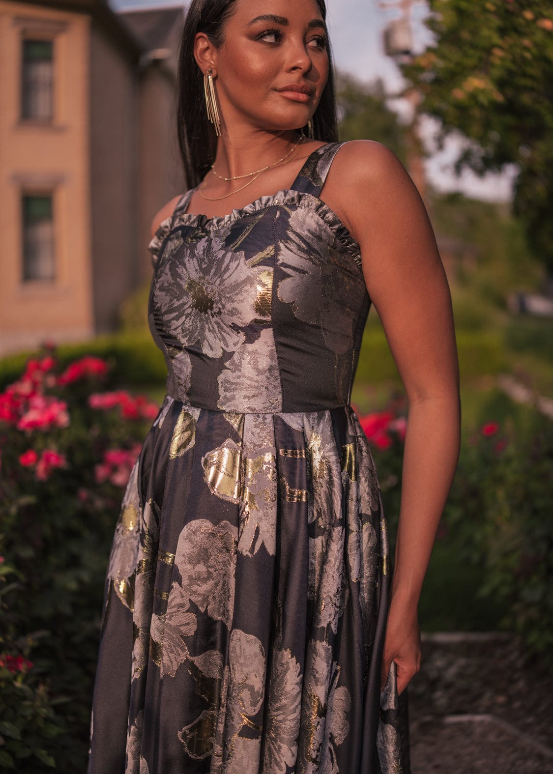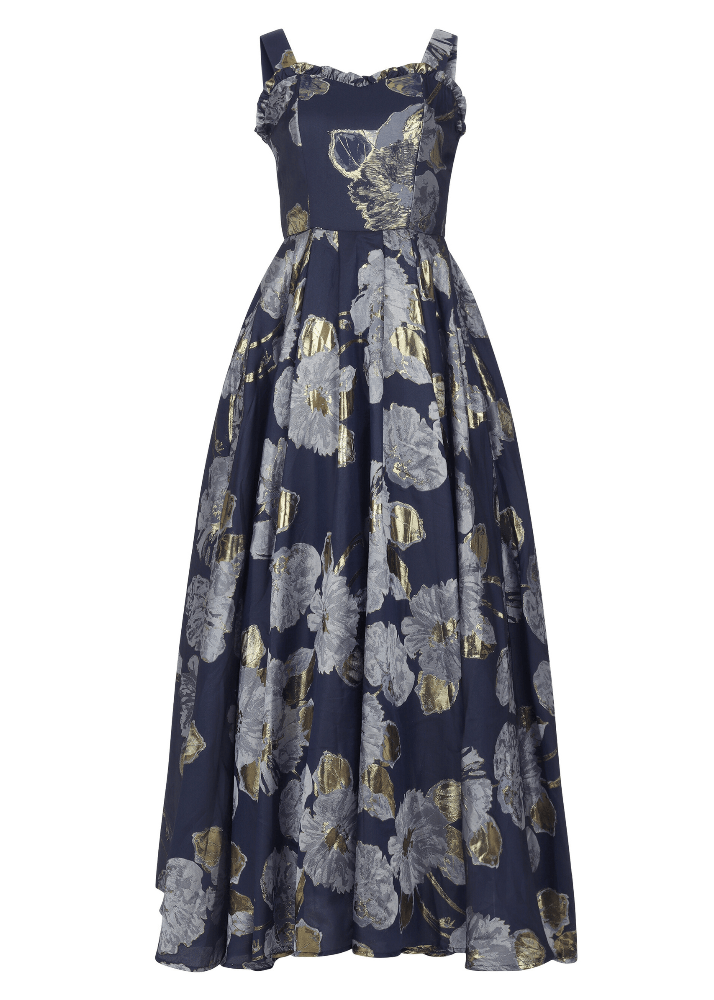 The Selene Dress is a dazzling blend of sophistication and celestial charm. Its deep midnight blue fabric, adorned with metallic silver and gold floral accents, evokes the beauty of a starry night. The elegant silhouette and delicate detailing make it a perfect choice for evening occasions where you want to shine. Step into the spotlight with a statement piece that captures the true essence of timeless glamour.