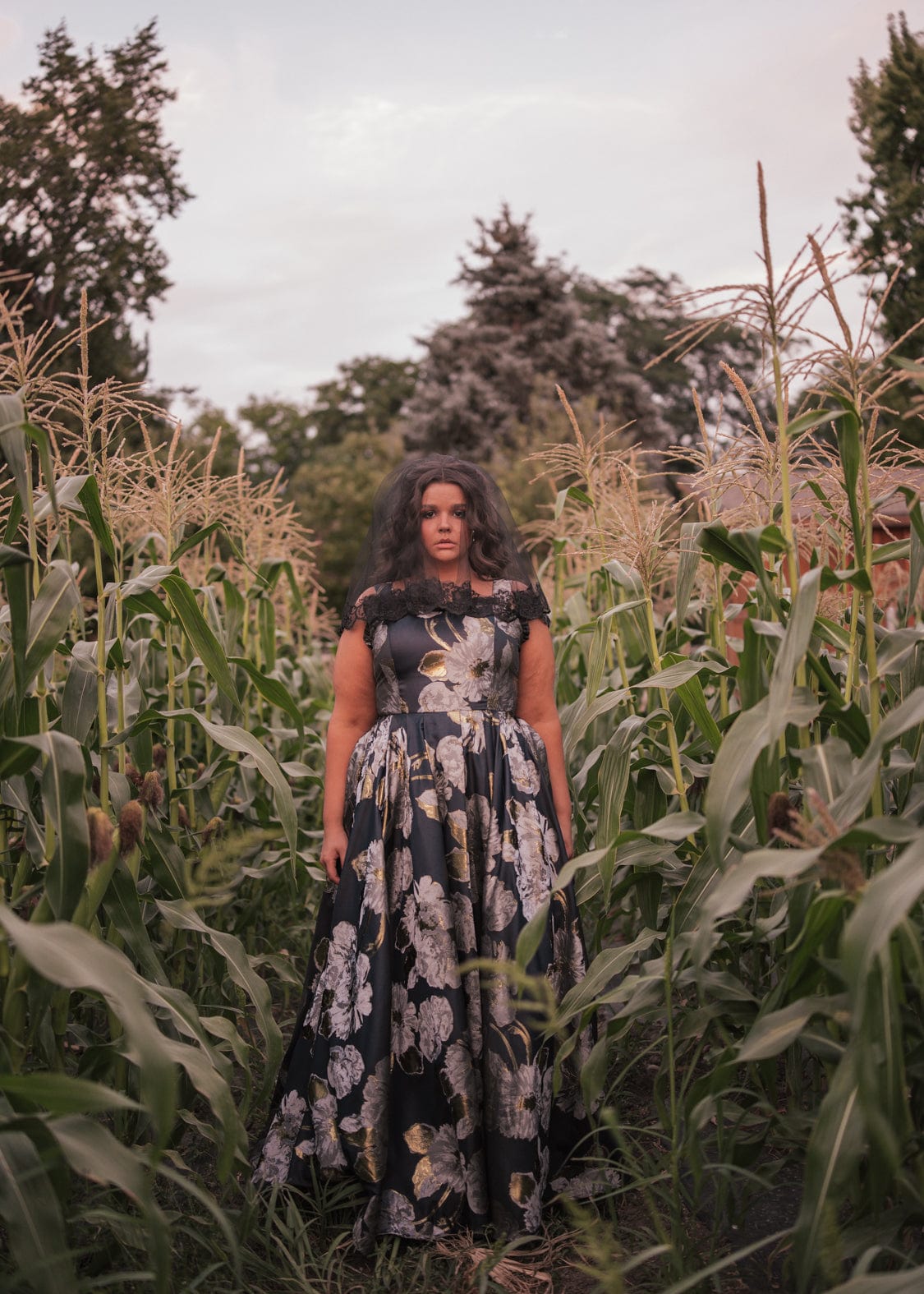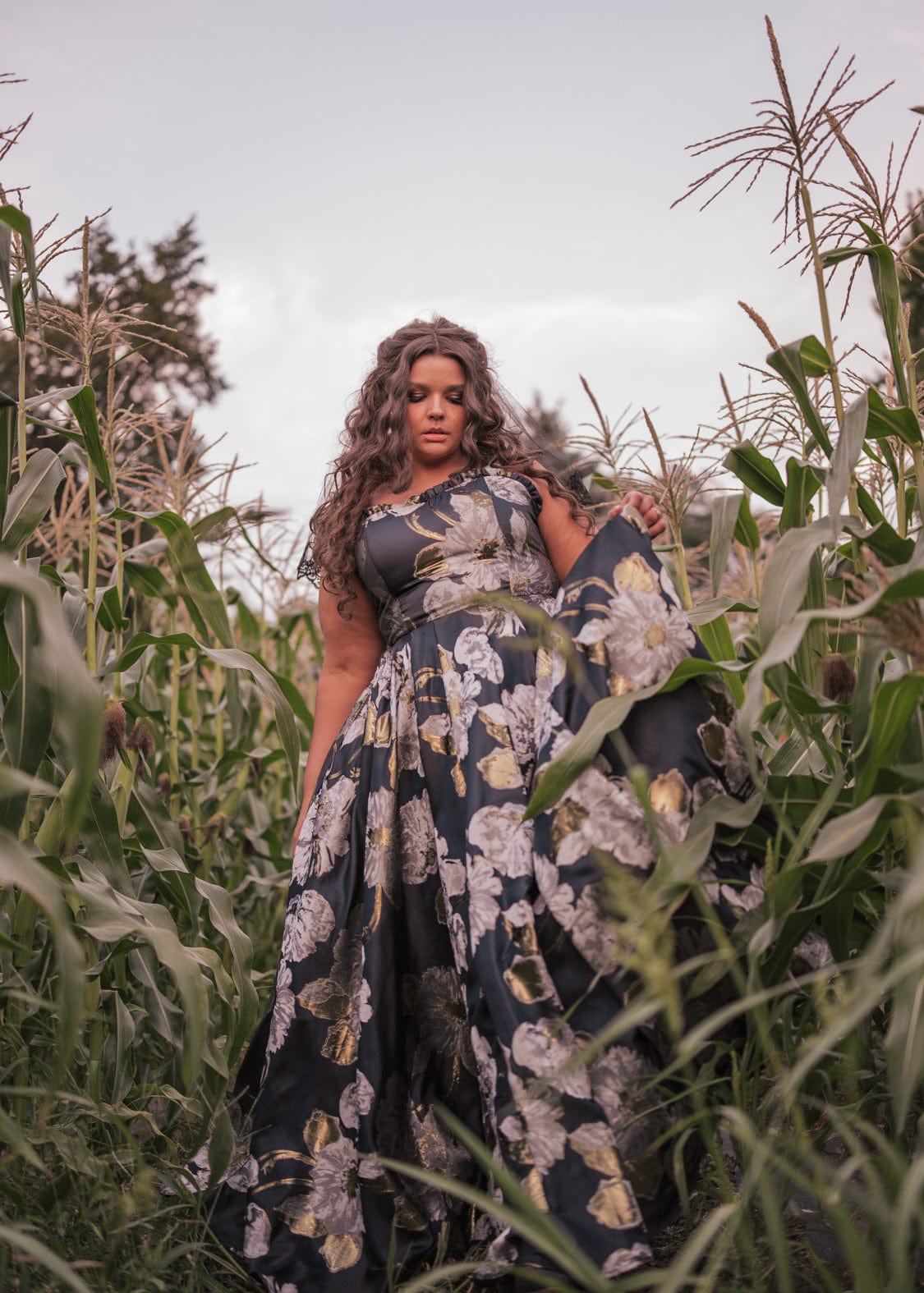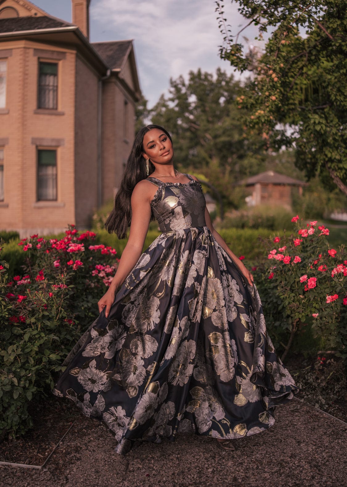 The Selene Dress is a dazzling blend of sophistication and celestial charm. Its deep midnight blue fabric, adorned with metallic silver and gold floral accents, evokes the beauty of a starry night. The elegant silhouette and delicate detailing make it a perfect choice for evening occasions where you want to shine. Step into the spotlight with a statement piece that captures the true essence of timeless glamour.