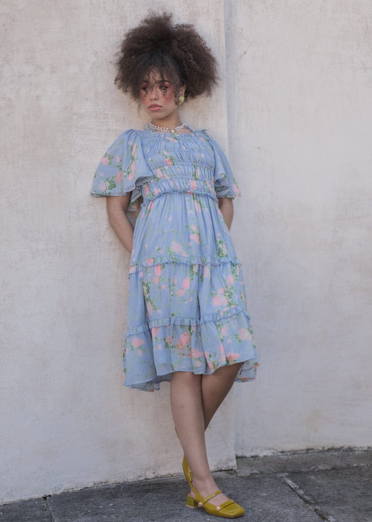 The Siena Dress is a romantic blend of vintage charm and effortless style. Featuring a soft blue floral print, smocked bodice, and flutter sleeves, it combines comfort with elegance. The tiered skirt adds graceful movement, making it perfect for garden parties, brunches, or any sunny day outing. This dress is a timeless choice for a feminine and flattering look.