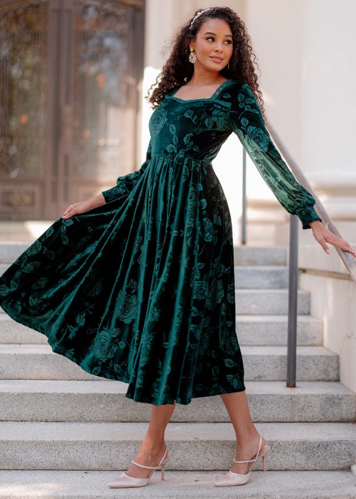 This gorgeous velvet dress is a showstopper for any event. The lace sweetheart neckline and soft floral accents are a perfect combination, while the inseam pockets add that extra level of style. This dress was made for you to look your best this holiday season!