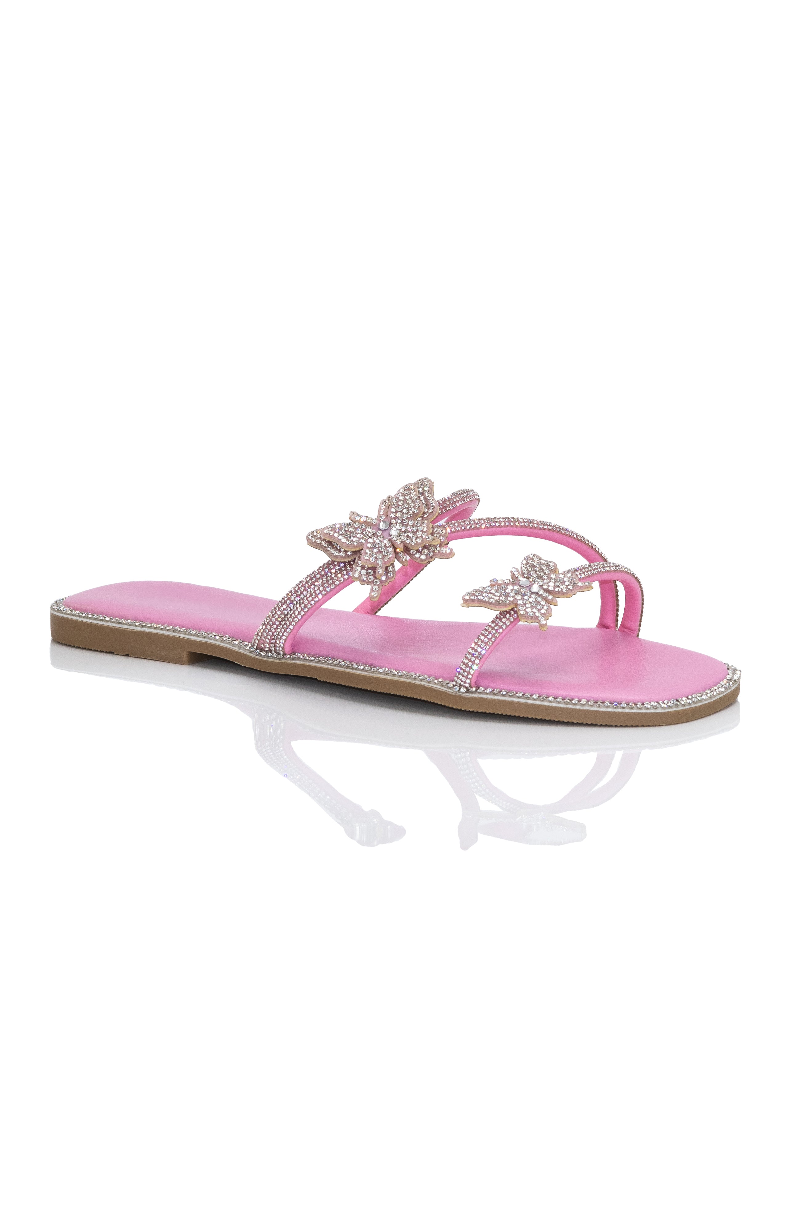 Add a touch of glamour to your summer look with Sumer - Embellished Slip On Flat Sandals! The lightly padded insole provides all-day comfort, while the embellished straps and edges add a touch of elegance. Slip them on effortlessly with the easy slip on entry and enjoy the open round toe design and rhinestone butterfly details. Perfect for any occasion, these sandals are true to size for your convenience.