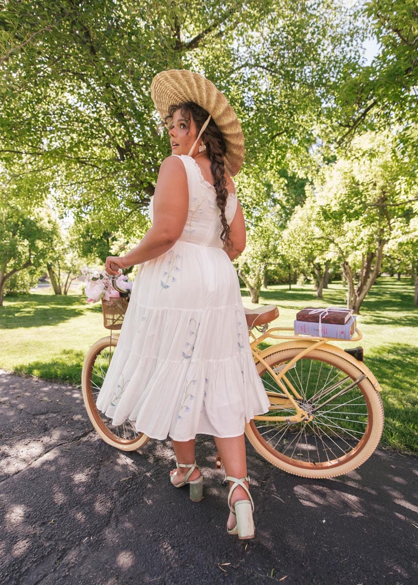 Embrace the serene beauty of the outdoors with our Summer Meadow Dress. This enchanting white dress features delicate blue floral embroidery and a tiered skirt that flows gracefully with every step. The fitted bodice and charming bow detail at the neckline add a touch of romantic elegance, making it perfect for picnics and sunny afternoon strolls. Complete with a wide-brimmed hat and a vintage bicycle, the Summer Meadow Dress captures the essence of idyllic summer days.