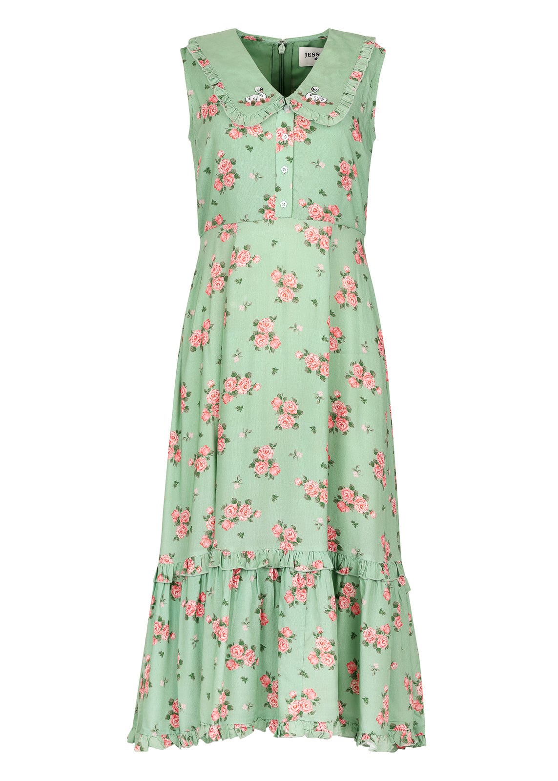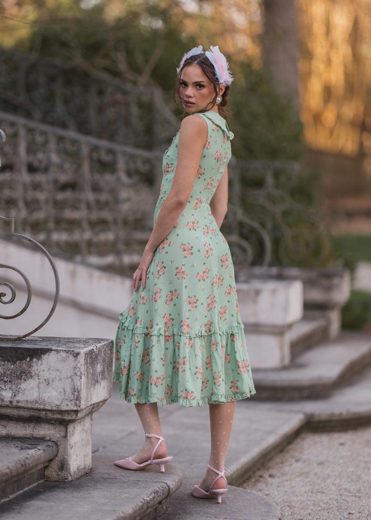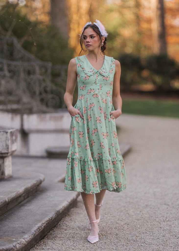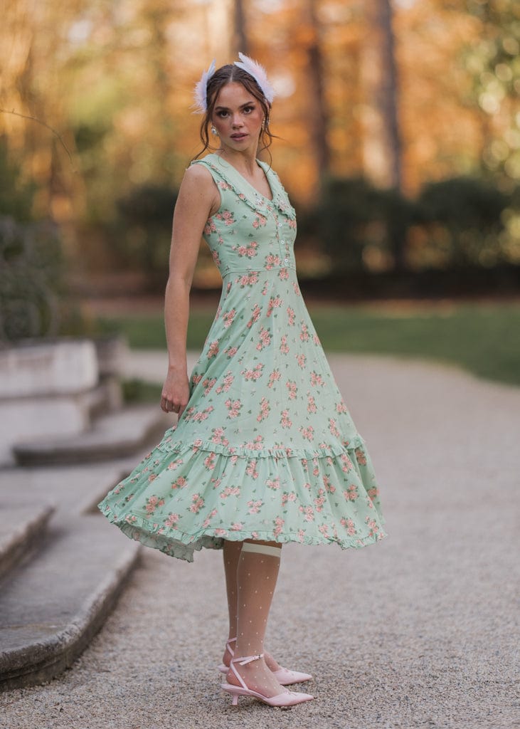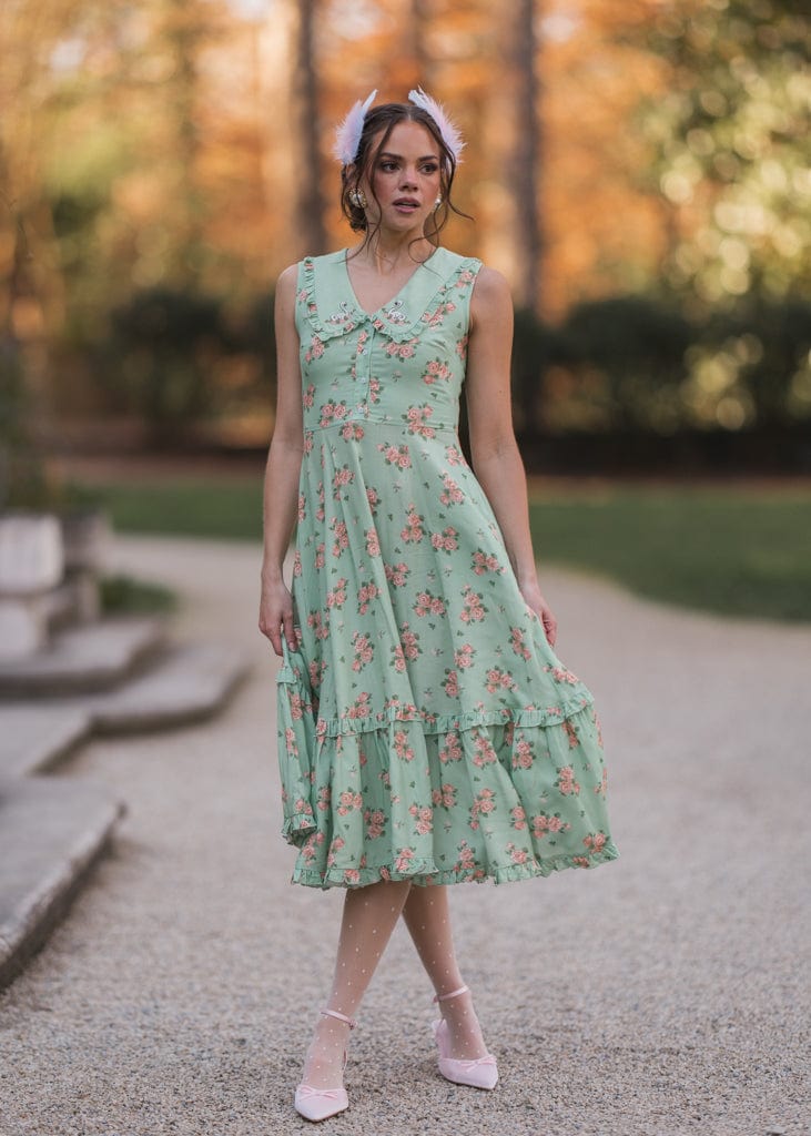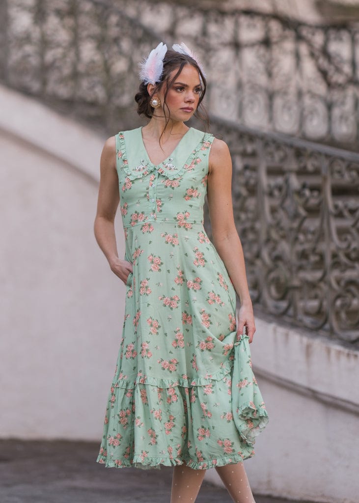 The Thea Dress is a delightful mix of vintage charm and playful elegance. Featuring a soft green floral print, a sweet Peter Pan collar with embroidered swans, and button-front detailing, it’s perfect for adding whimsy to your wardrobe. The ruffled hemline adds a feminine touch, making this dress ideal for tea parties, picnics, or casual outings. Its flattering silhouette and unique accents create a timeless look you’ll love.