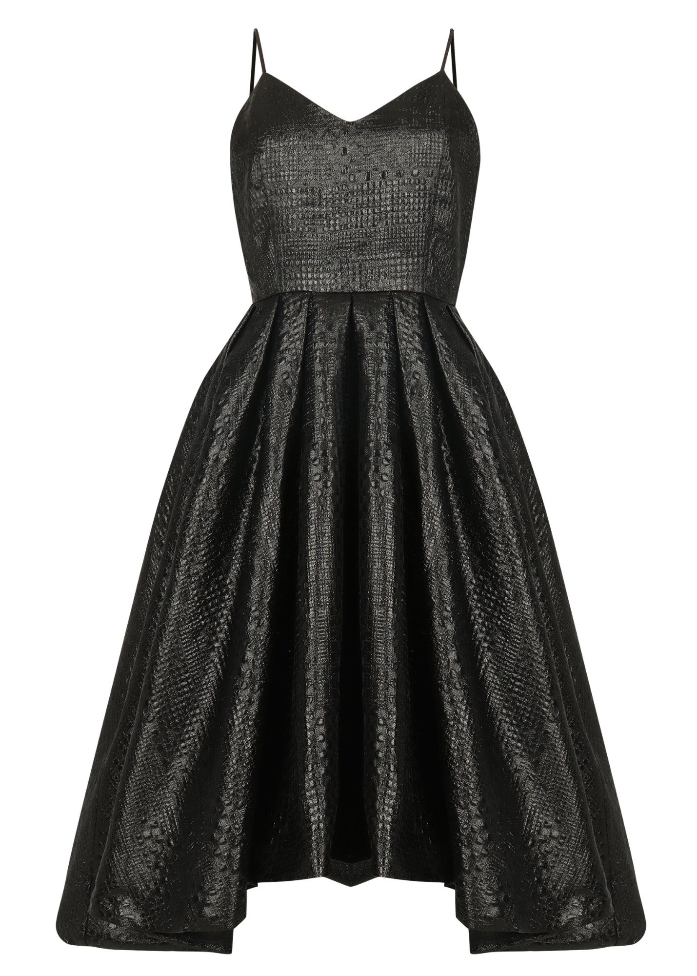 The Twila Dress is a stunning blend of elegance and edge, perfect for making a bold statement at any event. Crafted from textured black fabric with a subtle sheen, this fit-and-flare silhouette captures both sophistication and drama. The structured bodice with its adjustable straps gracefully balances the full, pleated skirt, creating a figure-flattering shape that moves beautifully. Ideal for evening occasions, galas, or a night out, the Twila Dress is a versatile showstopper.