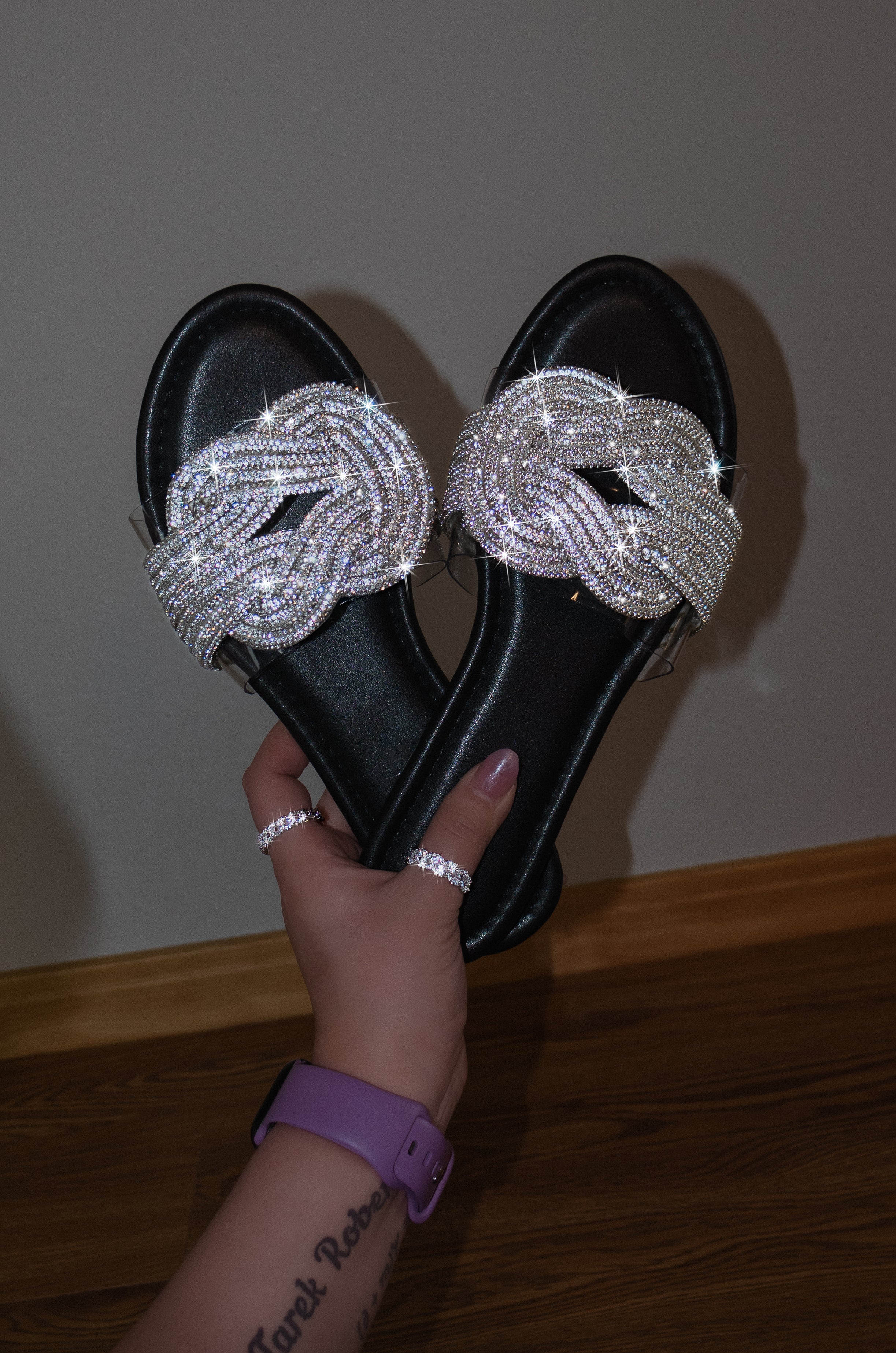 Introducing Valeria - the perfect combination of fashion and comfort. Slip into these embellished rhinestone sandals and elevate any outfit. With a lightly padded insole and open rounded toe, these slip-ons are not only stylish but also comfortable. Available in true-to-size fit.