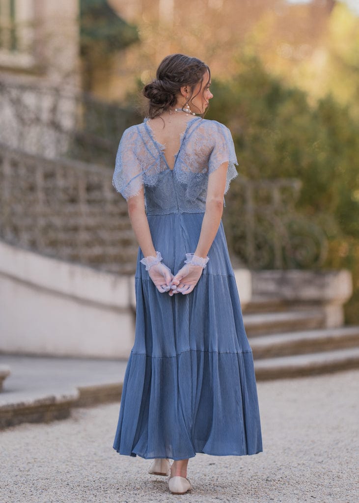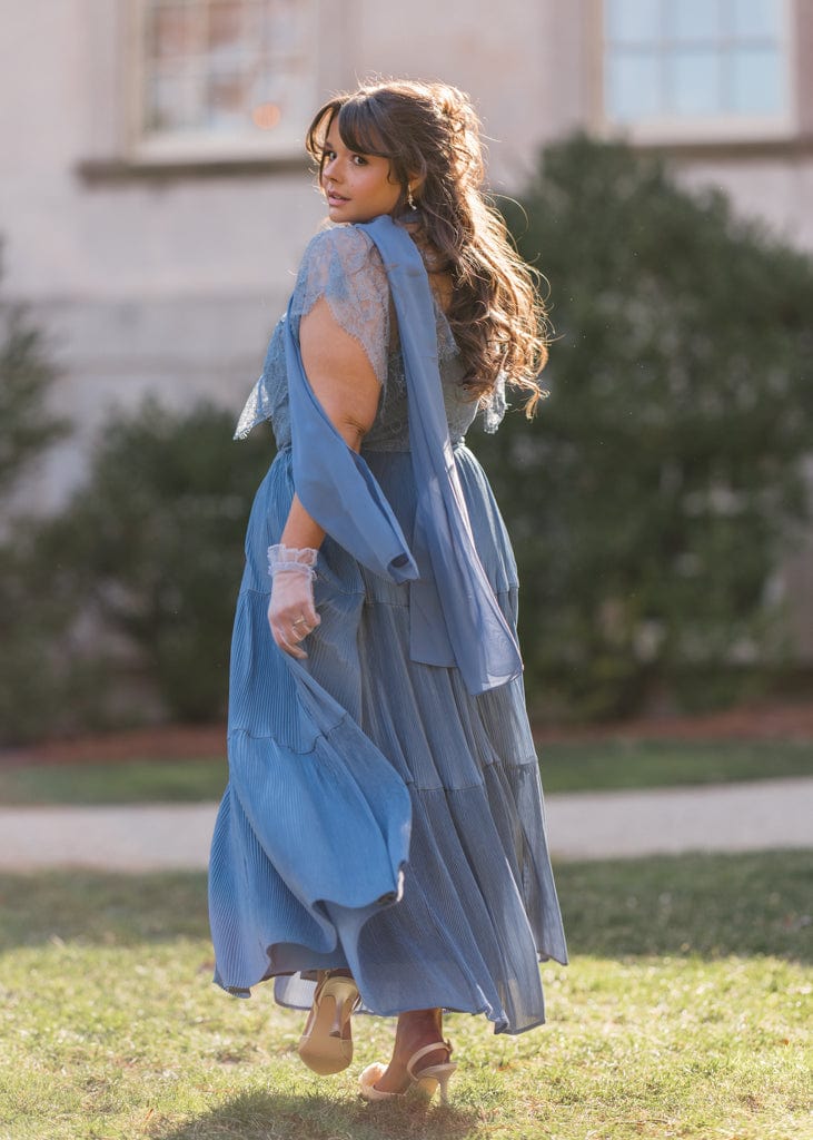 The Zuri Dress exudes elegance and romance with its intricate lace bodice and flutter sleeves. The flowy pleated skirt cascades gracefully in tiers, creating a timeless silhouette perfect for formal events or special occasions. With its soft, dreamy blue hue and delicate detailing, this dress is designed to make you feel effortlessly sophisticated and beautiful.